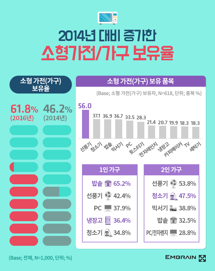 - 소형 가전·가구의 보유 크게 증가해(2014년 46.2%→2016년 61.8%), 1인가구의 보유율 높아