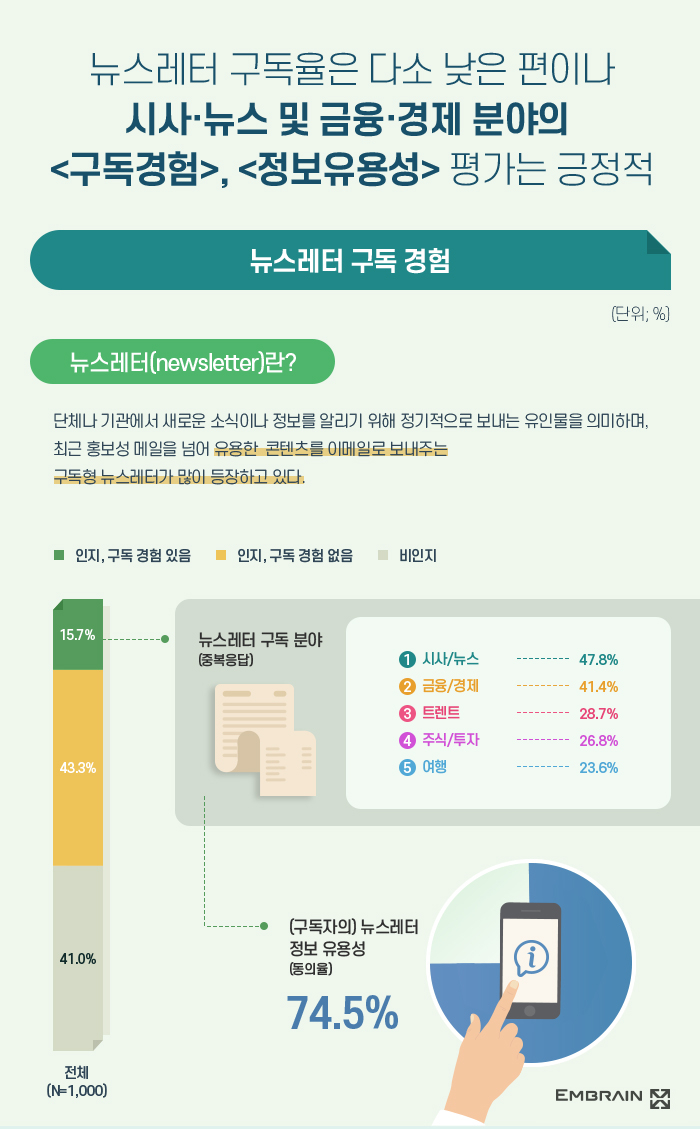 뉴스레터로 정보를 얻는 사람들 많지 않아, 15.7%가 뉴스레터 구독 경험