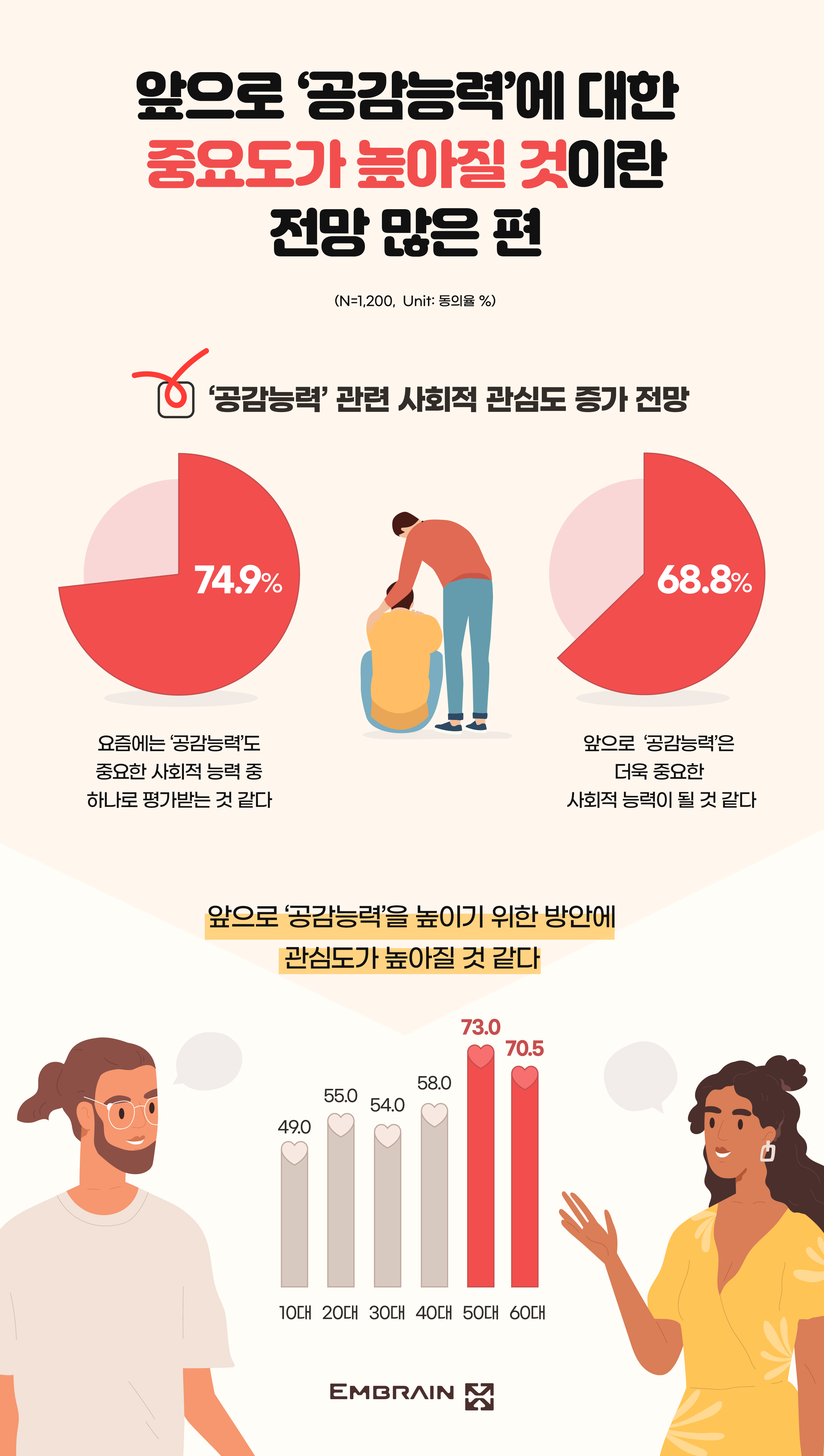 → 시장조사전문기업 엠브레인 트렌드모니터(trendmonitor.co.kr)가 전국 만 13~69세 남녀 1,200명을 대상으로 ‘일상적 감정 표현 및 공감능력 관련 인식 조사’를 실시한 결과, 대체로 자신과 가까운 사람들의 감정에 공감하는 성향을 보이는 가운데, 연령별로 ‘타인’에 대한 공감의 정도에는 차이가 있는 것으로 나타났다.