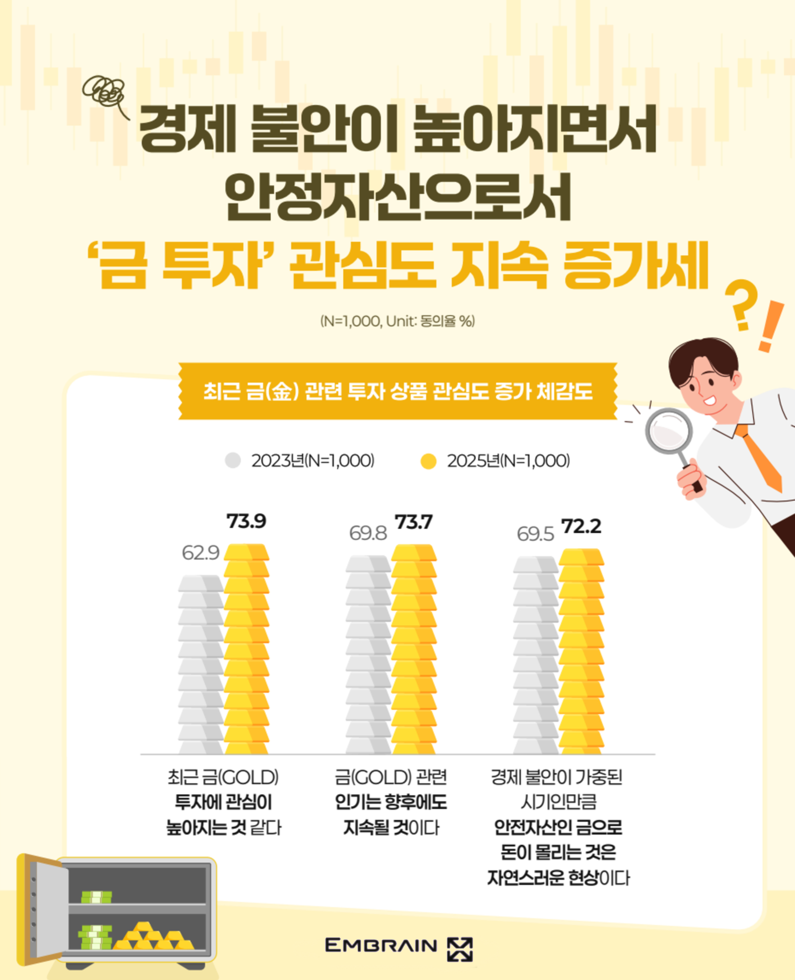 → 시장조사전문기업 엠브레인 트렌드모니터(trendmonitor.co.kr)가 전국의 만 19~59세 성인 남녀 1,000명을 대상으로 ‘2025 금(金) 시장 및 투자 관련 인식 조사’를 실시한 결과, 최근 불안한 국제정세로 금값이 치솟으면서 ‘금(金) 제품’ 구매에 대한 부담감이 소폭 높아진 것으로 조사되었다. 반면, 경제상황이 불안정한 만큼 ‘안전자산’에 속하는 ‘금’의 투자 가치를 보다 높게 평가하고 있는 모습을 확인할 수 있었다.