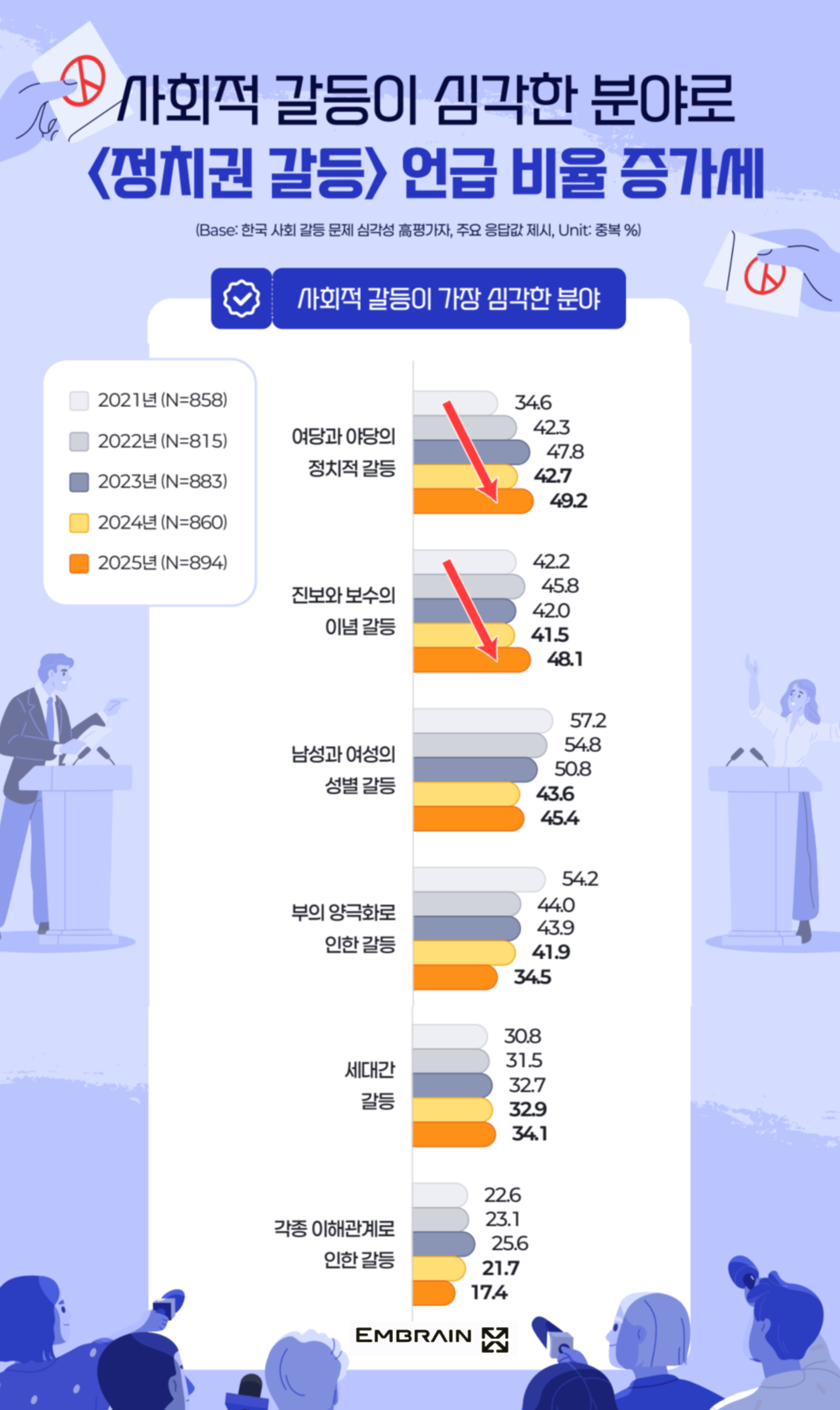 - 심각한 사회 갈등, 주로 ‘정치’, ‘성별’ 갈등 꼽아