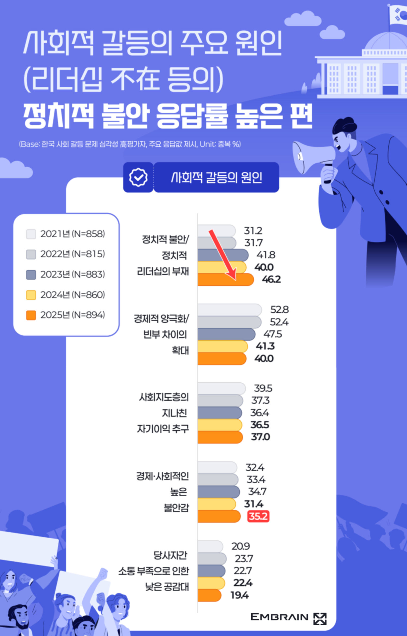 → 전반적으로 사회적 갈등 문제가 대두되고 있는 근본적인 원인으로 ‘소통의 부재’를 지적하는 경우가 많았다. 우리나라의 사회적 갈등은 자기입장만을 주장하고(80.4%, 동의율), 서로 의견을 들어보려 하지 않으며(78.1%), 양보하지 않기 때문(75.3%)이란 인식이 다수를 차지한 것으로, 이해와 배려의 부재가 사회적 갈등을 심화시키는 핵심 요인으로 작용하고 있는 모습이었다. 또한 갈등 상황에서 공정한 중재자가 없었다는 점(65.2%, 동의율)도 사회적 갈등을 원활하게 해소하지 못한 주요 원인으로 꼽혔는데, 공동체 내 신뢰 기반이 약화된 상태에서 공정한 판단을 내릴 수 있는 주체가 제 기능을 하지 못하고 있다는 점에서 우려스러운 대목이었다. 특히, 이는 기존의 갈등 조정 역할을 담당해왔던 언론과 정치권이 그 역할을 제대로 수행하지 못하고 있다는 인식과 관련이 있어 보였다. 한국의 사회적 갈등은 언론(77.2%(2024) → 83.6%(2025))과 정치집단들이 부추기는 경향이 있다(81.6%(2024) → 82.1%(2025))는 응답이 이전 조사 대비 소폭 증가한 것으로, 우리나라의 사회적 갈등이 심각한 것은 정치가 제대로 역할을 못하기 때문(79.7%(2024) → 80.3%(2025))이라는 인식도 여전히 강한 편이었다. 실제로 사회적 갈등의 원인으로 정치적 불안과 정치적 리더십의 부재(40.0%(2024) → 46.2%(2025))를 꼽은 비율이 이전 조사 대비 크게 증가했으며, 사회지도층이 지나치게 자기이익을 추구(36.5%(2024) → 37.0%(2025))하고 있다는 비판도 적지 않았다. 그럼에도 불구하고, 정치가 다양한 갈등을 해소하는 데 중요한 역할을 하고 있다(42.8%(2024) → 46.4%(2025))는 응답이 이전 조사 대비 소폭 증가한 가운데, 현 정권에서 사회적 갈등을 잘 해결할 것이라는 기대감(20.0%(2024) → 33.1%(2025))이 한층 높아진 모습을 보인 점이 주목할 만한 결과였다. 이는 정치적 평가를 넘어, 실질적인 해결과 통합을 바라는 사회적 요구가 반영된 결과로 풀이된다.