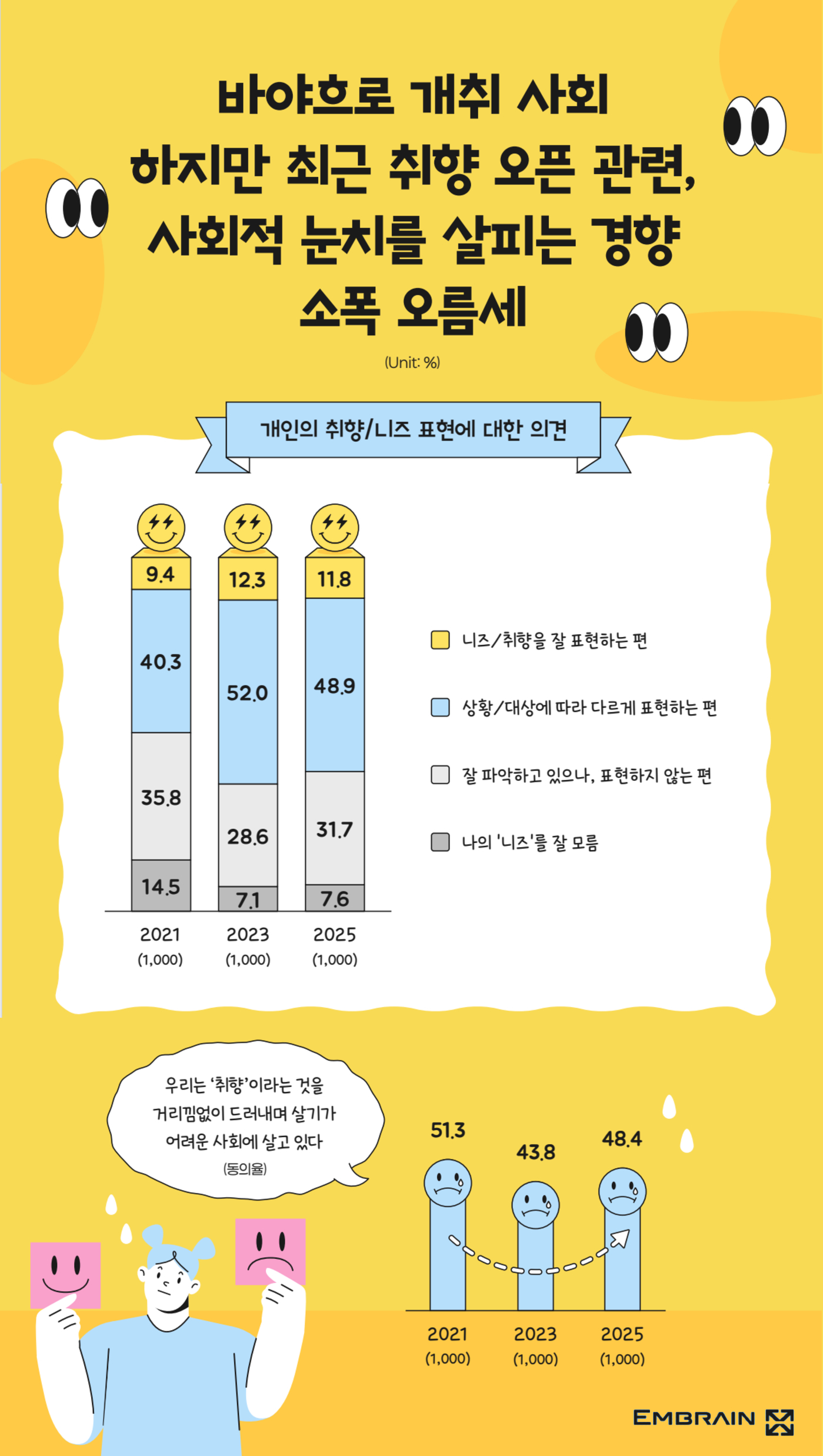→ 시장조사전문기업 엠브레인 트렌드모니터(trendmonitor.co.kr)가 전국의 만 19~59세 성인 남녀 1,000명을 대상으로 ‘2025 개인 취향과 도덕성의 상관관계 관련 조사’를 실시한 결과, ‘개인의 취향’은 상호 존중이 필요하다는 데에 공감하면서도, 사회적 기준에 대해서는 ‘공동체’를 우선시해야 한다는 인식이 뚜렷한 것으로 조사되었다. 아울러 자신의 취향을 자유롭게 표현하는 데에는 여전히 심리적 제약이 따르고 있는 모습까지 확인할 수 있었다.