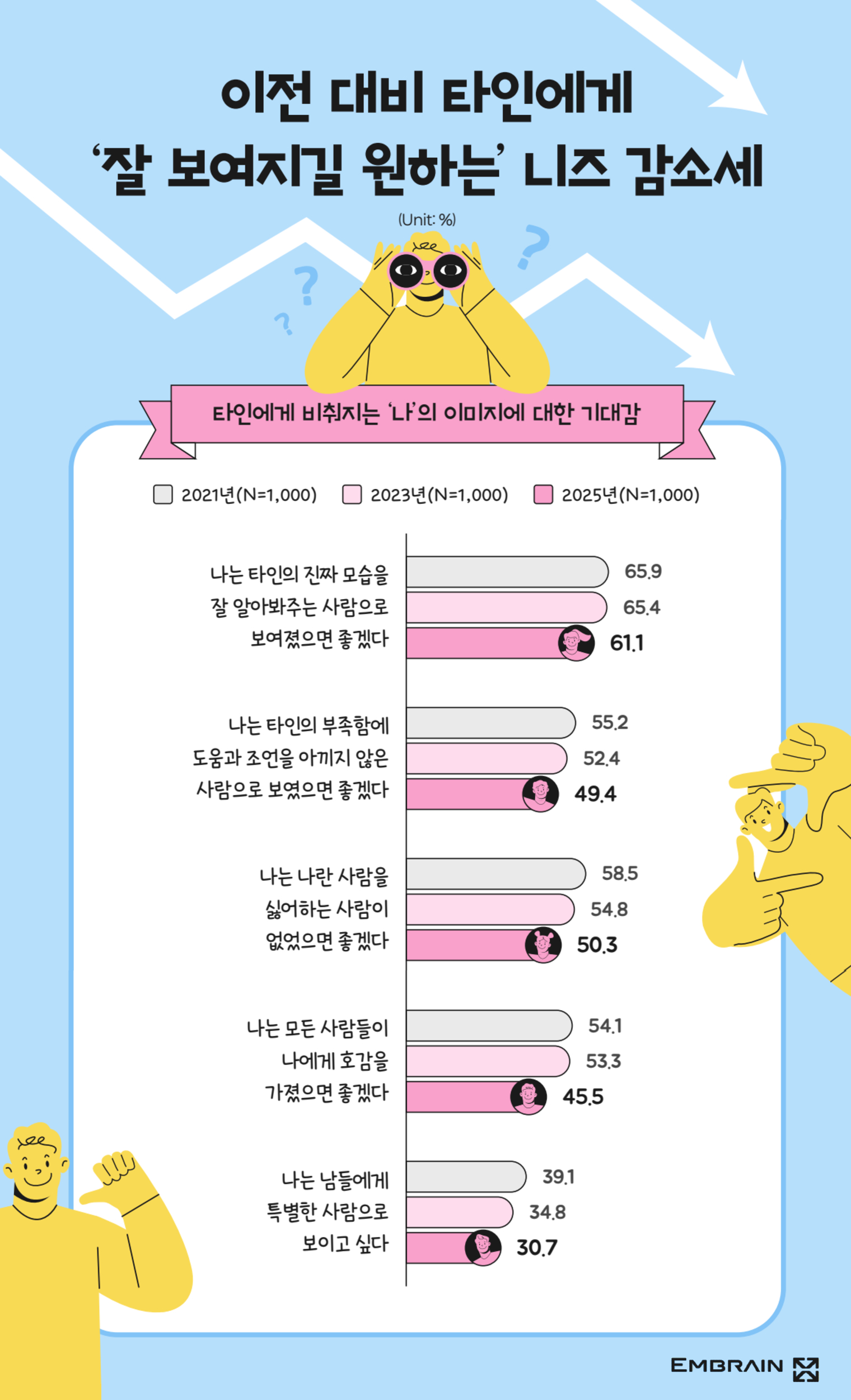 → 한편, 평소 타인의 시선을 의식하는 사람들이 다수(79.7%, 동의율)를 차지한 가운데, 타인에게 ‘호감형’ 이미지로 보이고 싶어하는 경향이 뚜렷한 모습을 확인할 수 있었다. 남들에게 알면 알수록 괜찮은 사람이고 싶고(77.6%, 동의율), 모나지 않은 사람으로 보이고 싶다(76.1%)는 인식이 높게 평가된 것으로, 좋은 사람이란 이미지를 남기고 싶다는 응답도 75.9%에 달한 결과를 보였다. 단, 자신을 싫어하는 사람이 없었으면 좋겠고(58.5%(2021) → 54.8%(2023) → 50.3%(2025)), 모든 사람들이 나에게 호감을 가졌으면 좋겠다(54.1%(2021) → 53.3%(2023) → 45.5%(2025))는 니즈가 이전 조사 이후 꾸준히 감소세를 보이고 있는 점은 주목할 만한 결과였다. 아울러 타인의 진짜 모습을 알아봐 주는 사람으로 보여졌으면 좋겠고(65.9%(2021) → 65.4%(2023) → 61.1%(2025)), 타인의 부족한 부분에 도움과 조언을 아끼지 않은 사람으로 비춰졌으면 좋겠다(55.2%(2021) → 52.4%(2023) → 49.4%(2025))는 응답이 이전 조사 대비 소폭 감소한 결과를 보이는 등 진정성 있는 인간관계에 대한 니즈가 한층 낮아지고 있는 모습을 확인할 수 있었다. 이는 ‘모두에게 좋은 사람’이 되기보다는, 타인과의 거리를 적절하게 유지하는 것을 선호하는 사회적 분위기가 반영된 결과로 풀이된다. 사람마다 각자의 취향이 있으며, 인간관계에서도 호불호가 존재할 수 있다는 점을 점차 인정하고 있기 때문으로 보인다.