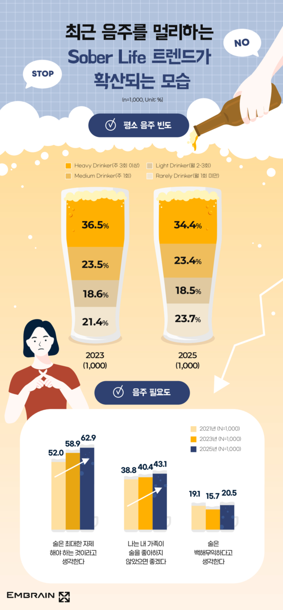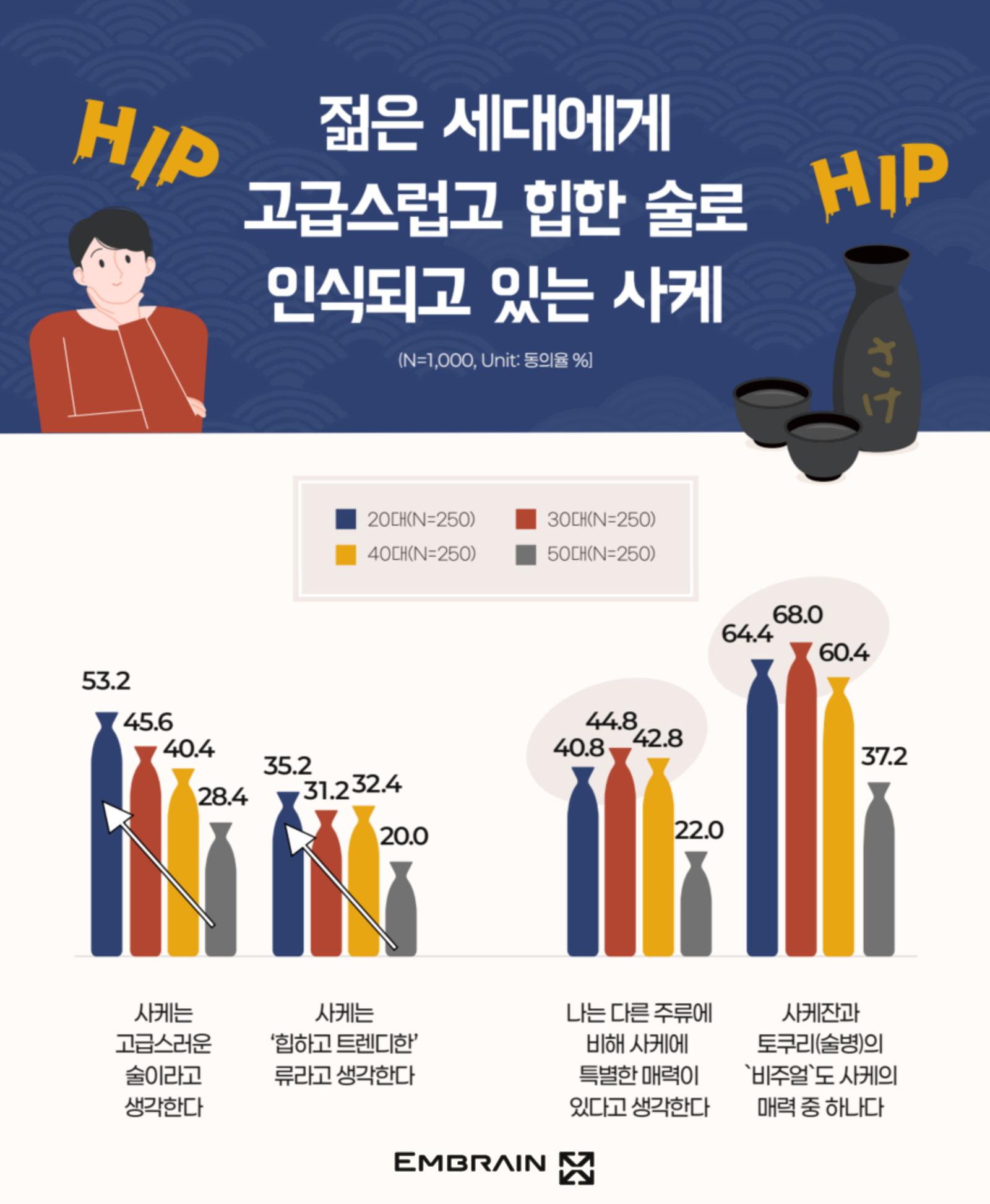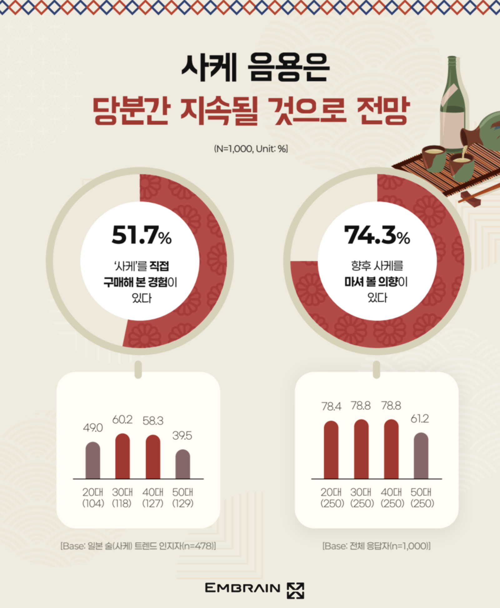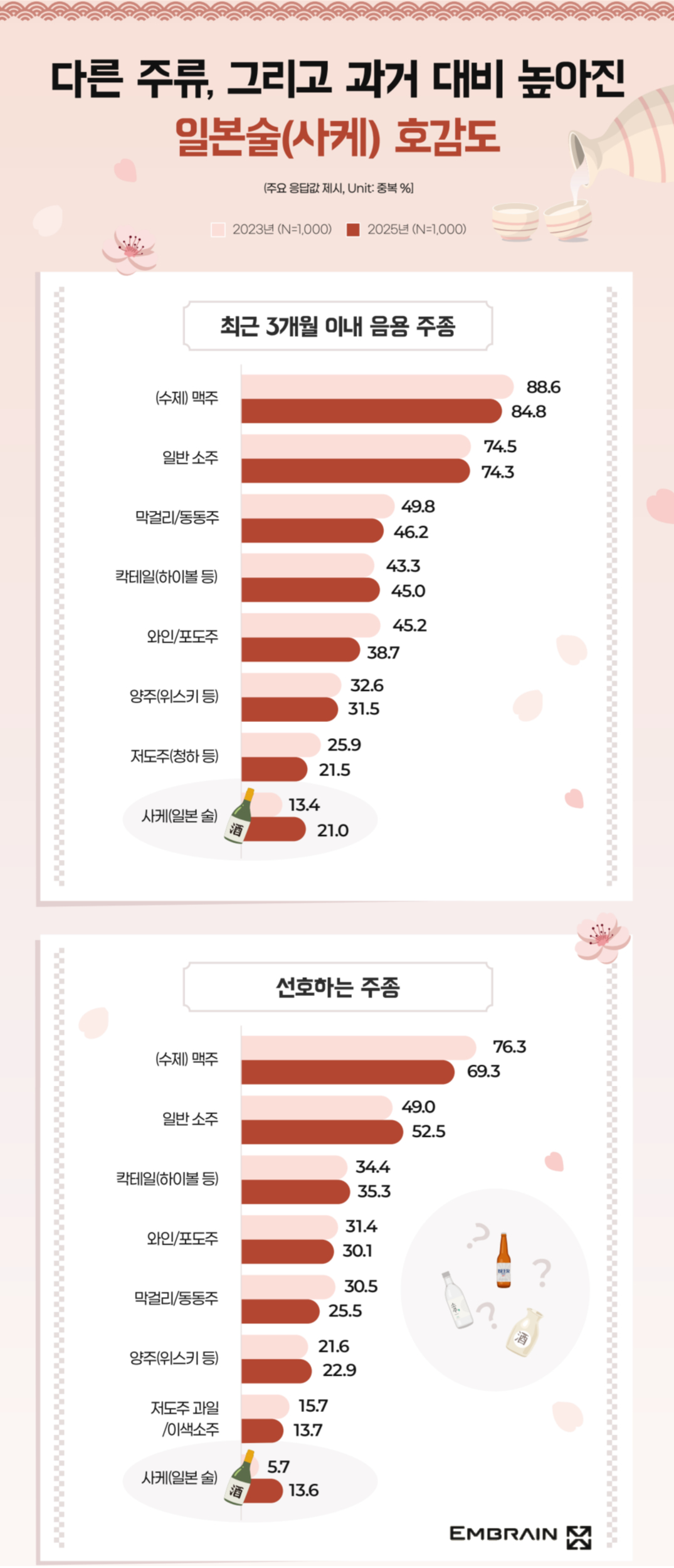 → 시장조사전문기업 엠브레인 트렌드모니터(trendmonitor.co.kr)가 주류 음용 경험이 있는 전국의 만 19~59세 성인 남녀 1,000명을 대상으로 ‘2025 주류 음용 및 일본 술(사케) 관련 U&A 조사’를 실시한 결과, ‘음주’의 긍정적인 역할에 공감하면서도, 과음을 경계하는 태도가 함께 나타났으며, 최근 젊은 세대를 중심으로 일본 술(사케)에 대한 관심이 높아지고 있는 모습을 확인할 수 있었다.
