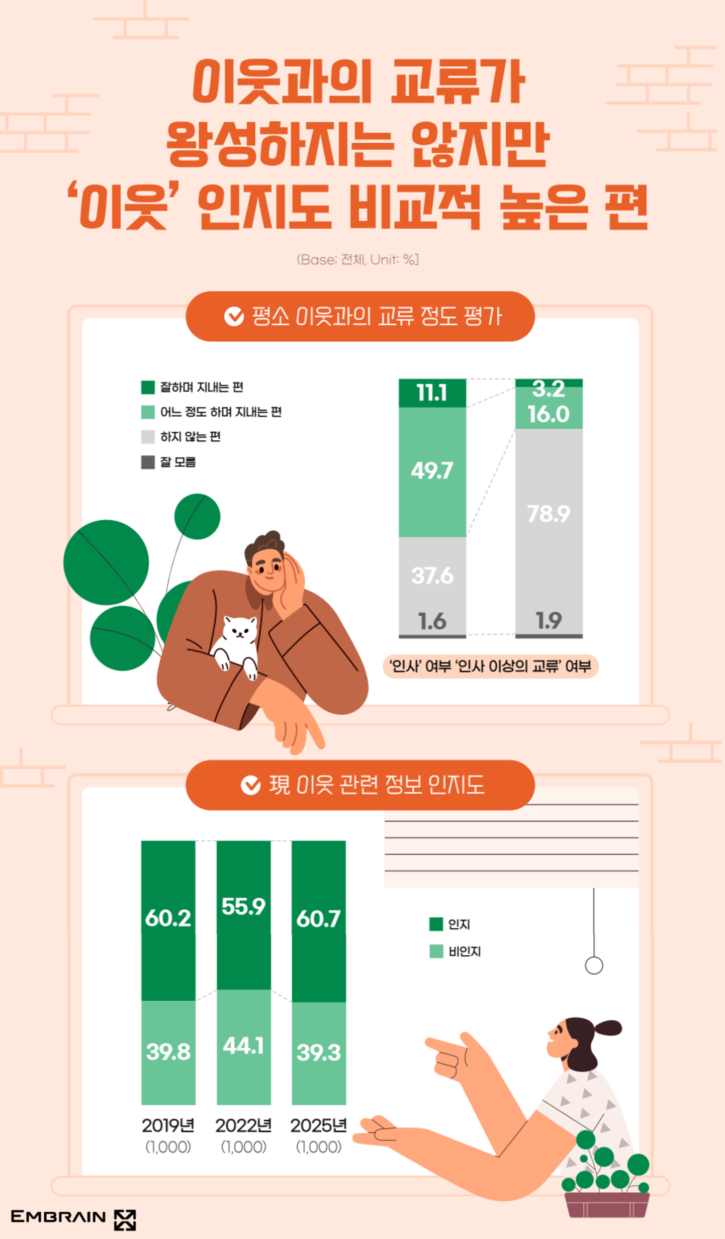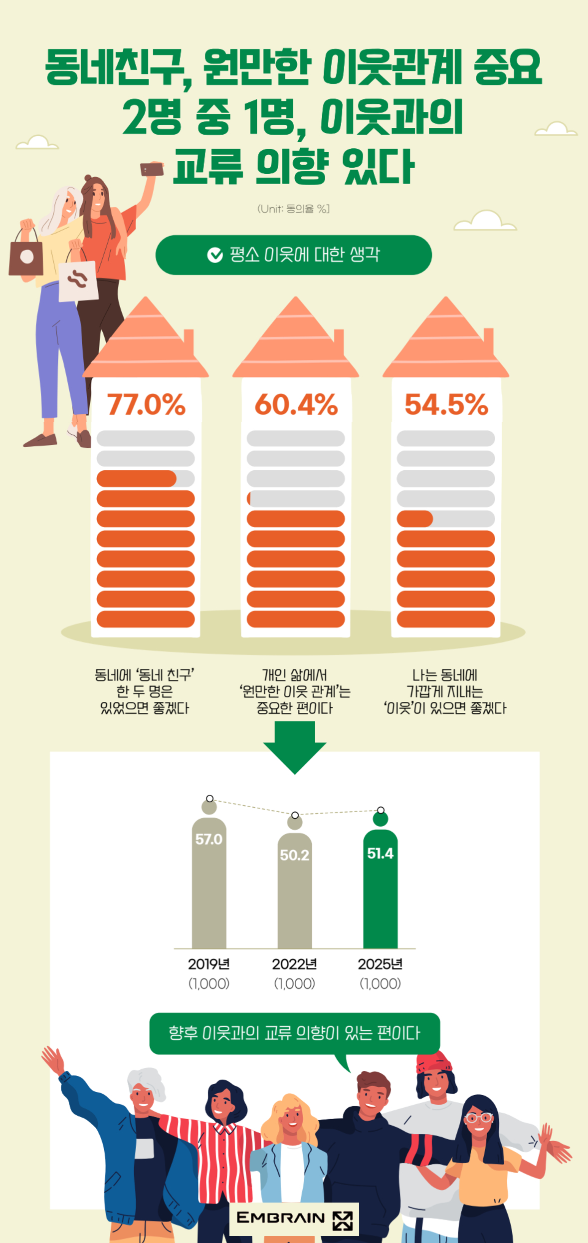 → 시장조사전문기업 엠브레인 트렌드모니터(trendmonitor.co.kr)가 전국의 만 19~59세 성인 남녀 1,000명을 대상으로 ‘2025 이웃 및 지역사회(동네) 관련 인식 조사’를 실시한 결과, 동네와 지역사회에 대한 관심이 높아지면서, 현재의 거주지에 계속 머물고자 하는 이른바 ‘정주 의향’이 강해지고 있는 것으로 조사되었다. 반면, 이웃과의 교류가 점차 줄어들면서, 이웃 관계보다 ‘동네 친구’에 대한 니즈가 높아지고 있는 모습을 살펴볼 수 있었다.