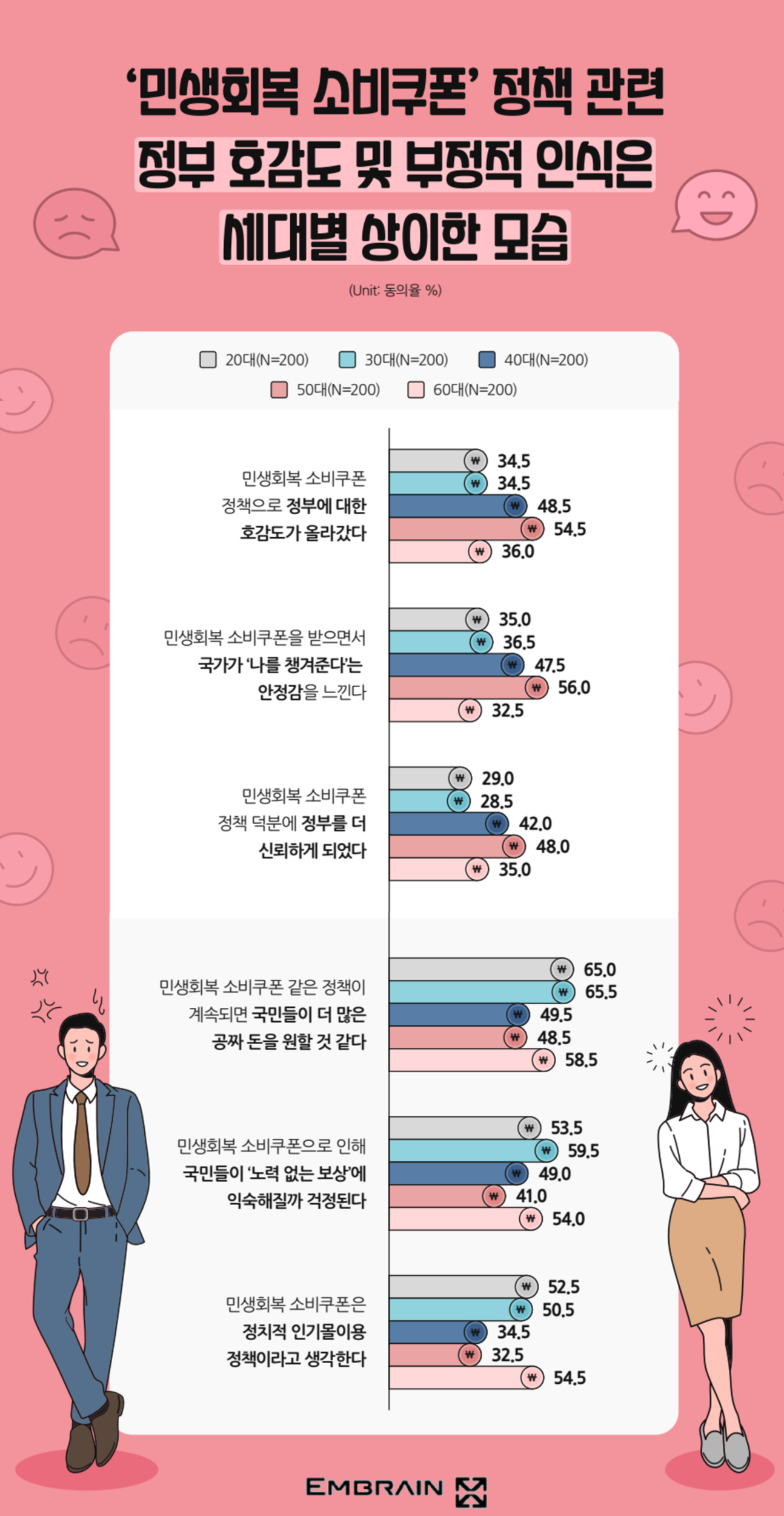 단, 민생회복 소비쿠폰으로 경제상황이 어느 정도 개선될 것으로 전망하면서도, 동시에 국가 재정 부담에 대한 우려(71.8%, 중복응답)가 큰 모습을 보인 점이 주목할 만한 결과였다. 전체 응답자의 상당수가 민생회복 소비쿠폰으로 인해 세금 부담이 늘어나는 것이 걱정된다(60.7%, 동의율)는 불안감을 내비친 것으로, 민생회복 소비쿠폰은 정부가 ‘빚을 내서 주는 용돈’(58.4%)이라는 지적도 과반으로 평가되고 있었다. 특히, 2030 저연령층의 경우 세금 부담에 대한 걱정이 타 연령층 대비 많은 편이었고(20대 69.5%, 30대 65.0%, 40대 57.0%, 50대 51.5%, 60대 60.5%), 민생회복 소비쿠폰 같은 정책이 계속되면 국민들이 더 많은 공짜 돈을 원할 것 같다(20대 65.0%, 30대 65.5%, 40대 49.5%, 50대 48.5%, 60대 58.5%)는 회의적인 시선도 강한 모습을 보였다. 아무래도 이들 세대는 향후 조세 부담의 상당 부분을 감당하게 될 가능성이 높다고 생각하는 세대인만큼, 정책 수혜보다 재정 책임에 대한 부담을 더 크게 체감하고 있는 것으로 풀이된다. 향후 경제 위기 시 민생회복 소비쿠폰과 같은 정책의 필요성(20대 38.5%, 30대 34.5%, 40대 51.0%, 50대 61.0%, 60대 40.0%)에 대해서도 세대 간 인식 차이가 뚜렷하게 나타났다. 자칫 이점은 세대 갈등 문제를 초래하는 사회적 이슈로 부각될 수 있는 만큼, 유사한 정책 도입 시 충분한 사회적 합의가 우선시 되어야할 것으로 보인다.