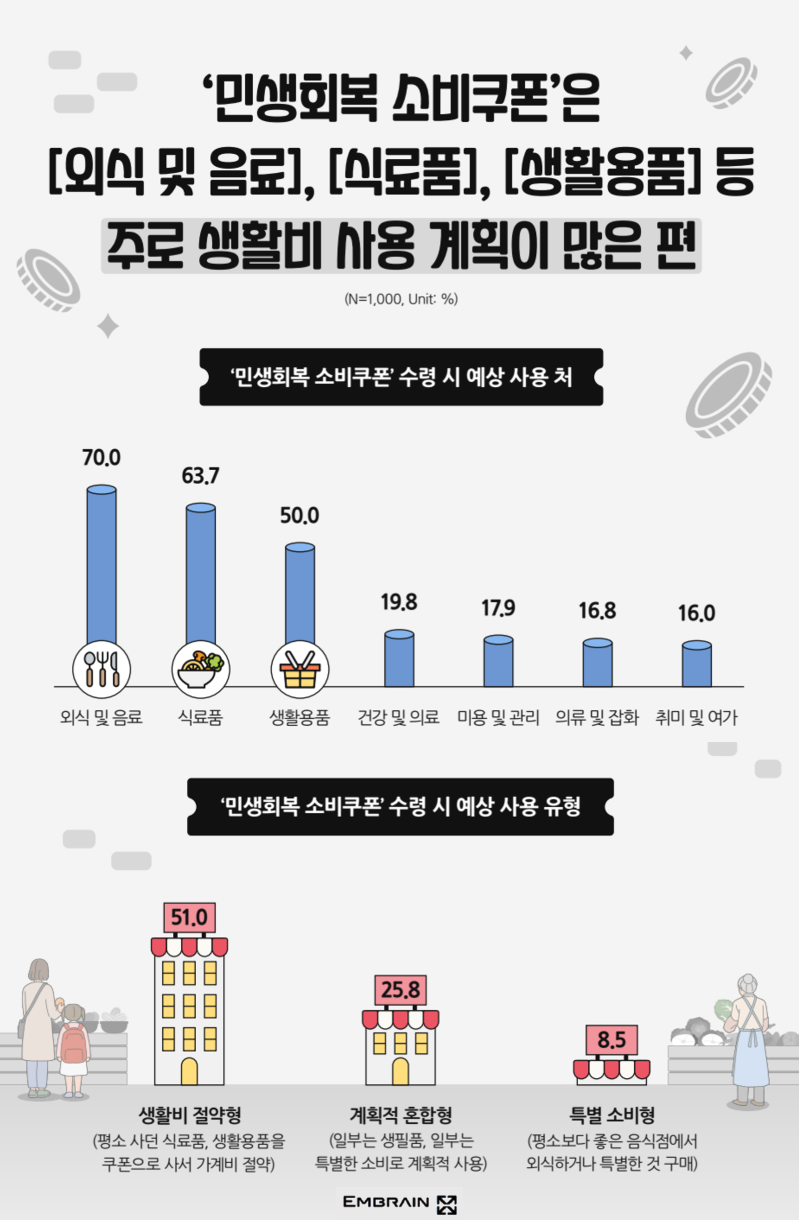→ 시장조사전문기업 엠브레인 트렌드모니터(trendmonitor.co.kr)가 전국의 만 19~69세 성인 남녀 1,000명을 대상으로 ‘(1차) 민생회복 소비쿠폰 관련 인식 조사’를 실시한 결과, 해당 정책에 대한 인지도와 참여 의향이 전반적으로 높게 나타난 가운데, 외식·식료품·생활용품 등 생활비를 절약하기 위해 소비쿠폰을 활용하고자 하는 니즈가 높게 평가되고 있었다.