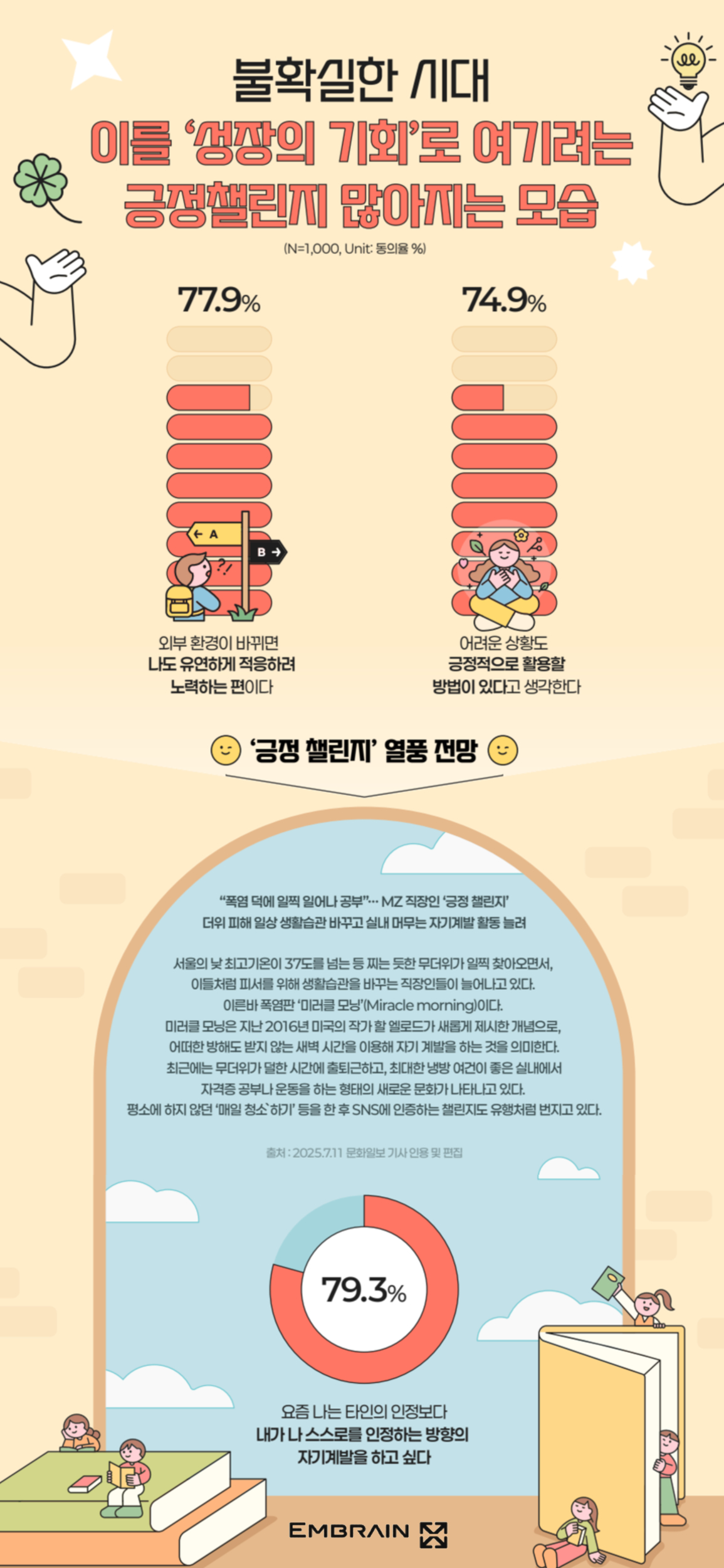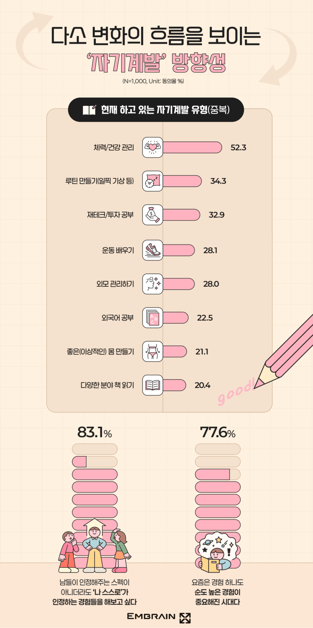 → 시장조사전문기업 엠브레인 트렌드모니터(trendmonitor.co.kr)가 전국의 만 19~59세 남녀 1,000명을 대상으로 ‘2025 자기계발 및 긍정 챌린지 관련 인식 조사’를 실시한 결과, 불안정한 사회 환경 속에서도 자기계발을 통해 삶의 균형을 찾으려는 태도가 뚜렷한 모습을 보였고, 타인의 평가보다 스스로 의미있다고 여기는 경험을 중시하는 흐름이 강해지고 있는 것으로 조사되었다.