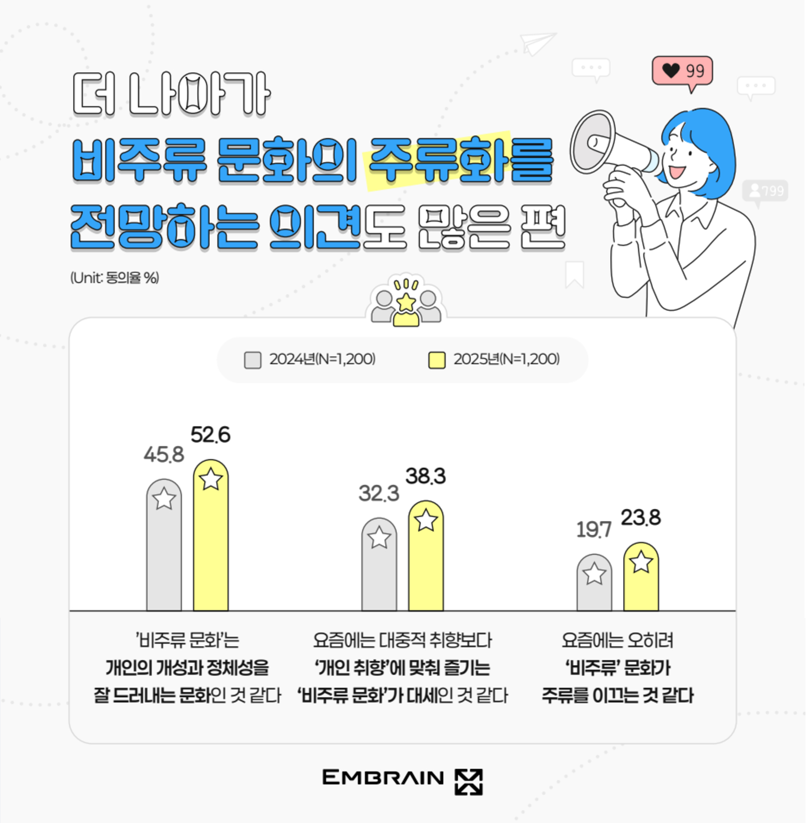 → 시장조사전문기업 엠브레인 트렌드모니터(trendmonitor.co.kr)가 전국 만 13~69세 남녀 1,200명을 대상으로 ‘2025 주류 vs 비주류 문화 관련 인식 조사’를 실시한 결과, ‘주류’와 ‘비주류’ 문화의 경계가 점점 희미해지면서, 개인의 취향과 만족감을 우선시하는 경향이 두드러지고 있는 것으로 조사되었다. 아울러 ‘비주류’ 문화가 더 이상 마이너한 관심사로만 여겨지지 않고, 새로운 트렌드를 이끄는 하나의 흐름으로 받아들여지고 있는 모습까지 살펴볼 수 있었다.