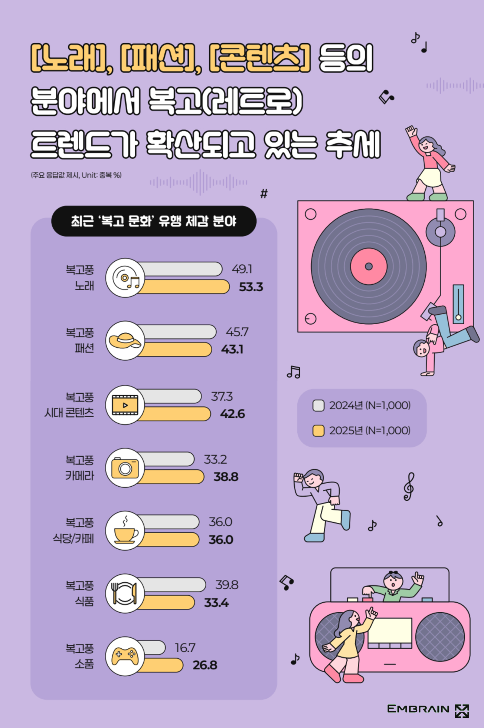 → 시장조사전문기업 엠브레인 트렌드모니터(trendmonitor.co.kr)가 전국 만 13~59세 남녀 1,000명을 대상으로 ‘2025 복고(레트로) 문화 및 명작 콘텐츠 관련 인식 조사’를 실시한 결과, 복고 문화에 대한 관심이 높아지고 있는 가운데, 과거 대중소비자들에게 인기를 모았던 ‘명작(고전) 콘텐츠’가 재평가되고 있는 것으로 조사되었다.