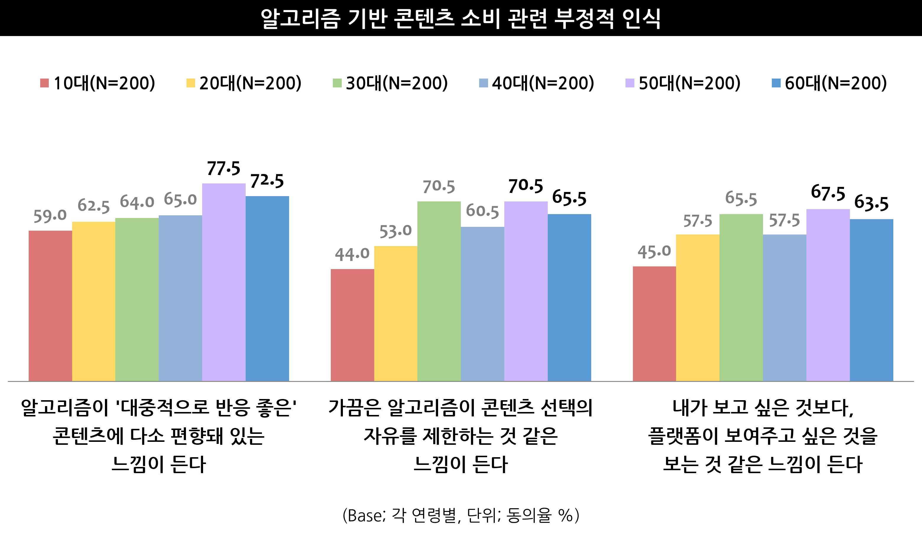 우선, 전체 응답자의 절반가량이 평소 콘텐츠를 직접 검색해서 찾기보다 알고리즘이 추천해 주는 콘텐츠에 의존(47.3%, 동의율)하는 경향을 보였고, 콘텐츠를 찾아보기 보다는 자연스럽게 ‘보게 되는 것’을 좀 더 선호(46.5%)하는 모습을 확인할 수 있었다. 아울러 알고리즘이 요즘 유행하는 것을 놓치지 않고 잘 보여주는 것 같다(55.9%, 동의율)는 인식이 과반으로 평가되는 등 알고리즘 기반 콘텐츠를 어느정도 신뢰하고 있는 태도까지 살펴볼 수 있었다. 실제로 주요 콘텐츠 소비 방식으로 알고리즘 추천에 기반한 콘텐츠 시청(41.2%, 중복응답)을 꼽은 비율이 가장 많았고, 키워드 검색으로 직접 콘텐츠를 탐색한다(24.0%)는 응답이 그 뒤를 이었다. 특히, 저연령층일수록 알고리즘 추천을 그대로 따르는 경우가 많은 편이었고(10대 53.0%, 20대 53.5%, 30대 53.5%, 40대 36.0%, 50대 29.5%, 60대 21.5%), 고연령층은 키워드 검색을 통해 직접 원하는 콘텐츠를 찾아보는 경향(10대 11.0%, 20대 17.0%, 30대 16.5%, 40대 29.5%, 50대 31.0%, 60대 39.0%)이 뚜렷한 특징을 보였다. 저연령층에서 알고리즘이 자신의 취향을 잘 반영한다고 느끼는 비율(10대 66.5%, 20대 58.0%, 30대 49.5%, 40대 29.5%, 50대 36.0%, 60대 29.5%)이 높았던 반면, 고연령층에서는 알고리즘이 대중적으로 반응이 좋은 콘텐츠에 다소 편향되어 있고, 가끔은 선택의 자유를 제한하는 것 같다는 지적이 많은 만큼(하단 그래프 참조), 고연령층은 알고리즘이 특정 취향을 강화할 수 있다는 점에 대해 상대적으로 민감하게 반응하고 있음을 엿볼 수 있었다.
