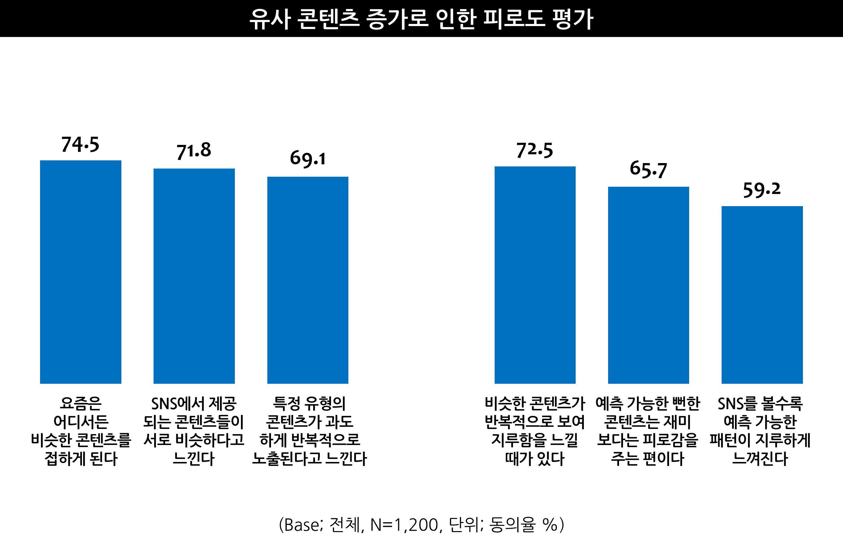 → 전반적으로 알고리즘 기반 콘텐츠에 대한 의존도가 높아지고 있는 가운데, 유사한 콘텐츠에 대한 거부감이 커지는 모습은 주목할 만한 결과였다. 전체 응답자의 상당수가 요즘은 어디서든 비슷한 콘텐츠를 접하게 되고(74.5%, 동의율), SNS에서 제공되는 콘텐츠가 서로 비슷하다고 느낀다(71.8%)는 데에 공감을 내비친 것으로, 비슷한 콘텐츠가 반복적으로 보여 지루함을 느낄 때가 있다는 응답이 72.5%에 달한 결과를 확인할 수 있었다. 아울러 특정 유형의 콘텐츠가 과도하게 반복적으로 노출된다고 느끼는(69.1%, 동의율) 경우가 많았고, 그만큼 예측 가능한 콘텐츠에 대한 피로도(65.7%)가 높은 특징을 보였다. 실제로 평소 콘텐츠를 보다가 끝까지 소비하지 못했던 경험(86.2%)이 많은 편이었는데, 그 이유로 내용이 예상 가능해 지루했기 때문(51.4%, 중복응답)이라는 응답이 가장 높게 나타났다. 유사한 콘텐츠에 지속적으로 노출될수록 이용자들의 이탈 가능성이 높아질 수 있다는 점을 예상해 볼 수 있는 대목이었다. 이 때문인지 대중소비자들은 의도치 않게 발견한 콘텐츠나(73.6%, 동의율), 예상치 못한 콘텐츠를 접할 때 더 큰 재미를 느끼는 모습(68.2%)을 보이고 있었다. 특히, 검색 과정에서 우연히 발견한 콘텐츠(49.9%, 중복응답)나 관련 없는 게시물(41.0%)을 통해 접한 콘텐츠가 오히려 신선한 경험으로 여겨지고 있는 모습까지 살펴볼 수 있었다. 개인 맞춤형 콘텐츠를 제공하는 알고리즘으로 인해 피로감이 누적될 가능성이 높은 만큼, 향후 콘텐츠를 노출시키는 방식에 있어서 얼마나 다양한 선택지를 제공하고 의외성을 담보하는지가 중요한 과제가 될 것으로 보인다.