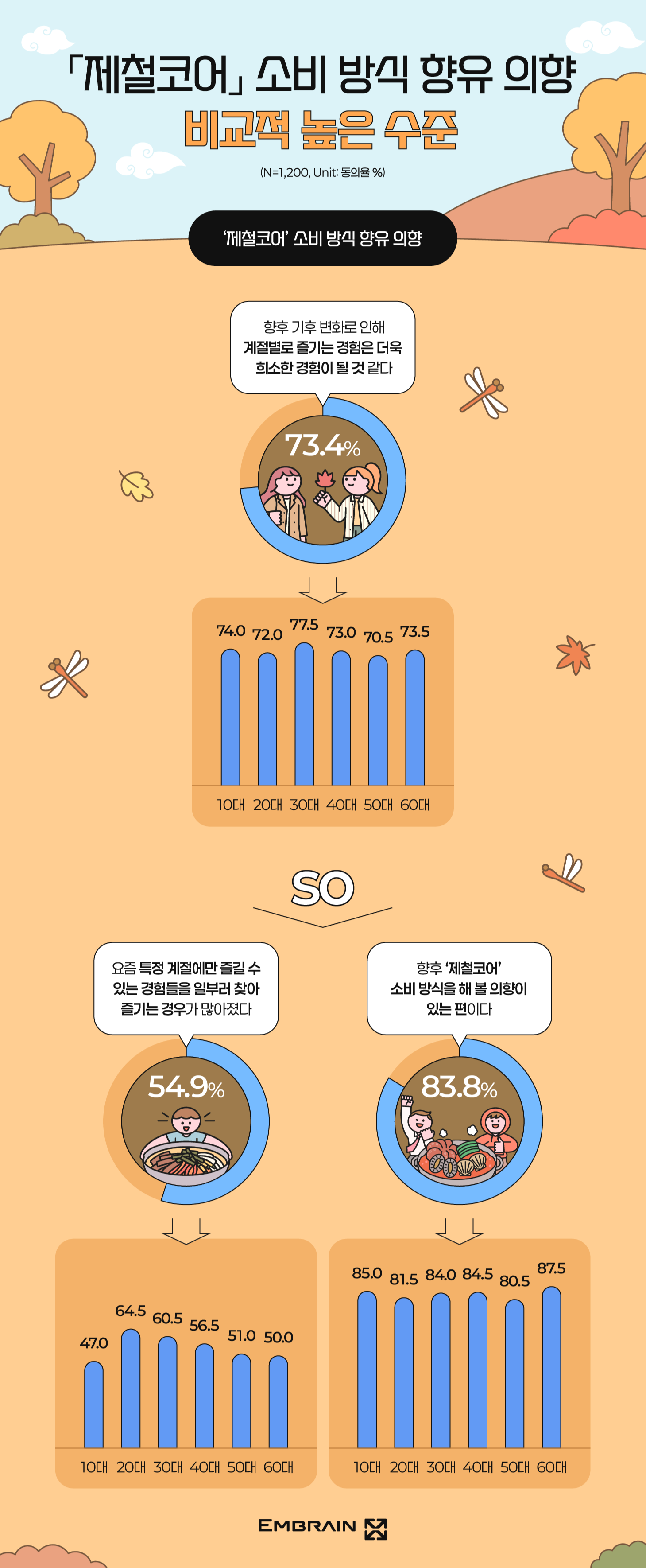 → 시장조사전문기업 엠브레인 트렌드모니터(trendmonitor.co.kr)가 전국 만 13~69세 남녀 1,200명을 대상으로 ‘제철코어 소비 트렌드 관련 U&A 조사’를 실시한 결과, 대중소비자들은 사계절의 변화를 적극적으로 체감하며 계절별 음식이나 활동을 즐기는 경향이 강한 것으로 조사되었다. 이에 따라 일상 전반에 ‘제철코어’ 소비 트렌드가 확산되고 있는 모습까지 살펴볼 수 있었다.