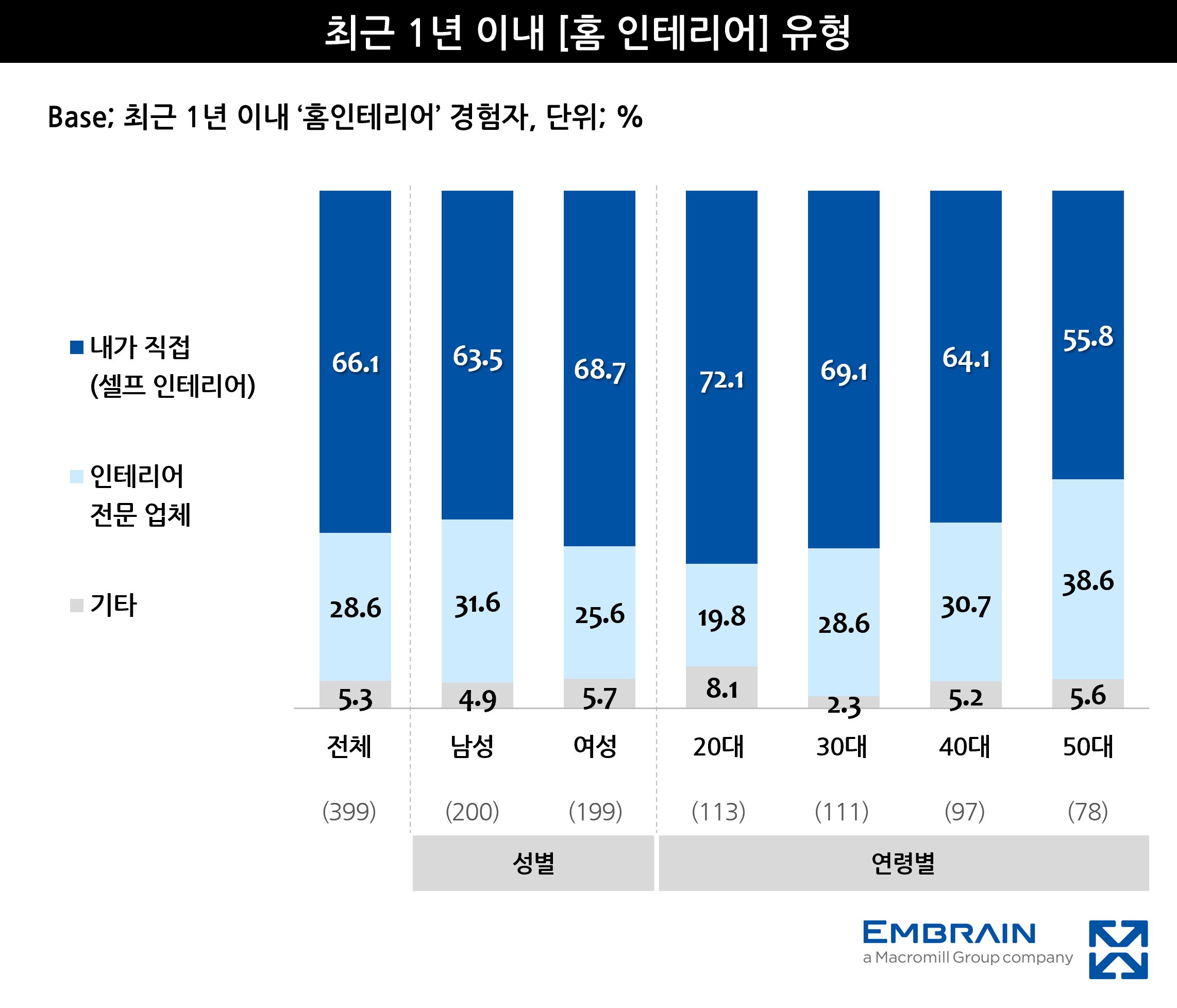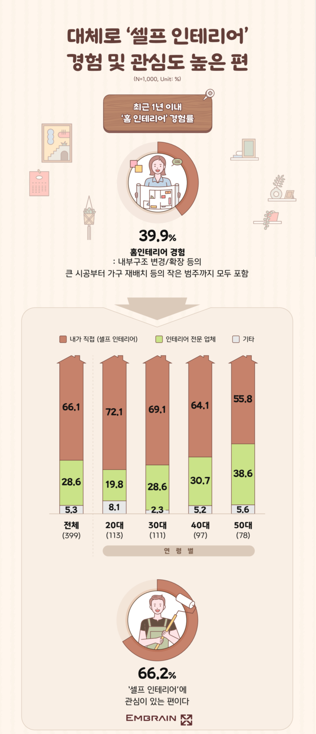 실제로, 전체 응답자 10명 중 4명(39.9%) 정도가 최근 1년 이내에 시공, 가구 재배치 등 ‘인테리어’를 해본 경험이 있다고 응답한 가운데, 그 중 상당수(66.1%)가 셀프 인테리어를 진행한 것으로 나타났다. 홈인테리어를 하게 된 이유로는 집안 분위기를 전환하기 위해서(42.6%, 중복응답)란 응답이 가장 많았고, 젊은 세대를 중심으로 ‘개성/취향을 표현하기 위해서(20대 21.2%, 30대 17.1%, 40대 8.2%, 50대 12.8%)라는 응답이 두드러지는 특징을 보였다. 특히, 이들 세대는 평소 정기적으로 집 인테리어를 하며 기분 변화를 즐기는 경향이 타 연령층 대비 강한 편이었고(20대 45.6%, 30대 42.0%, 40대 32.8%, 50대 29.2%), ‘자가’가 아니더라도 자신이 머무는 공간의 인테리어를 잘 해놓고 살고 싶은 니즈(20대 71.6%, 30대 64.8%, 40대 65.2%, 50대 64.8%)가 뚜렷한 모습을 보였다. 젊은 세대가 고연령층에 비해 홈인테리어에 대한 관심이 좀 더 높다는 것을 확인할 수 있는 대목이었다.