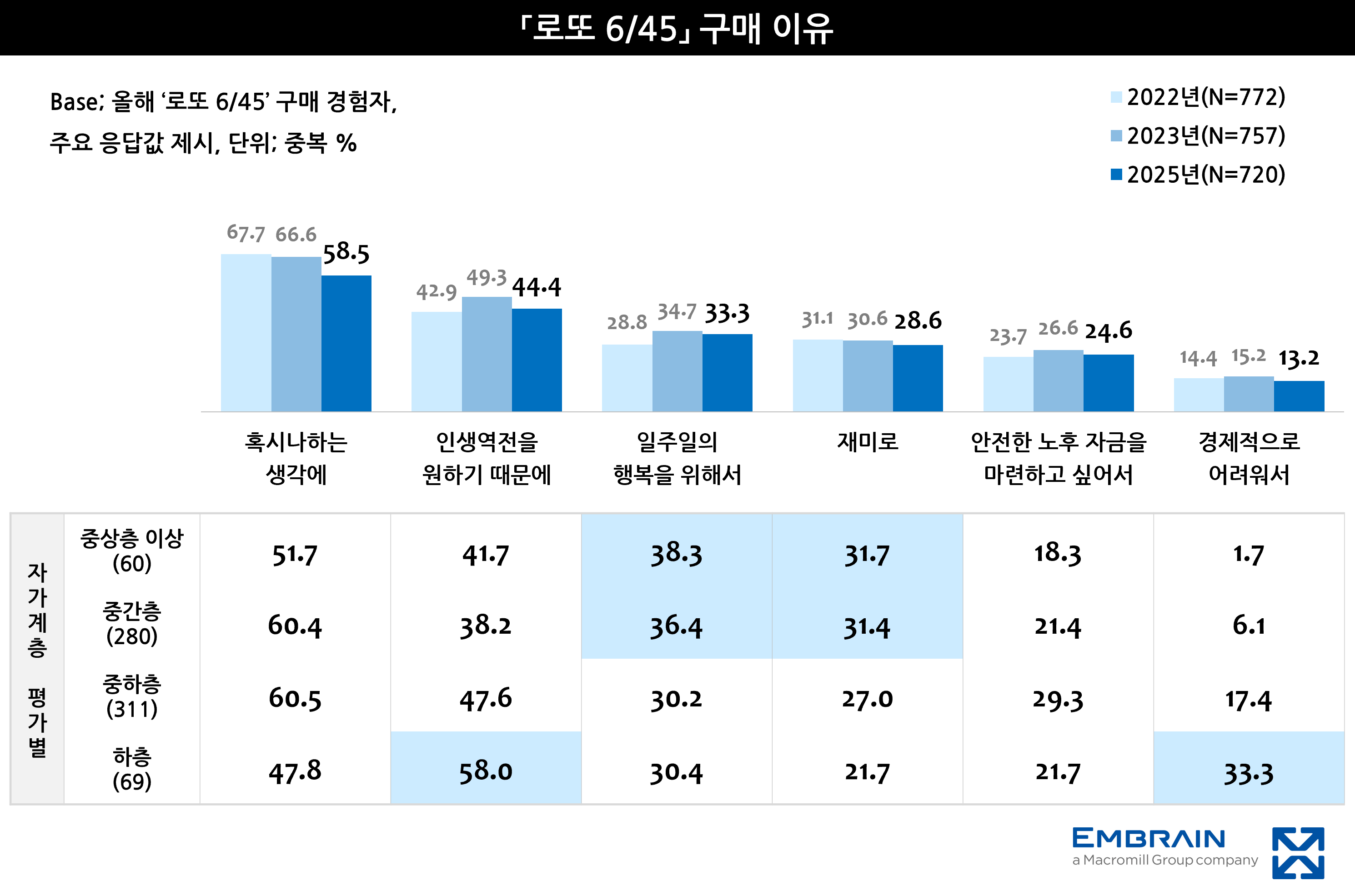 우선, ‘로또 6/45’에 대한 인지율(89.3%)이 높은 수준으로 평가된 가운데, 인지자의 대다수(80.6%)가 올해(2025년) 로또를 구매한 경험이 있는 것으로 나타났다. 로또를 구매한 이유로는 ‘혹시나’ 하는 마음(58.5%, 중복응답)과 인생 역전에 대한 기대감(44.4%)을 주로 꼽아, 당첨 가능성에 대한 희망 때문에 로또를 구매하는 경우가 많은 모습을 보였다. 실제로 전체 응답자의 상당수는 로또가 심리적인 위안을 줄 수 있다는 데에 공감을 표했고(55.0%, 동의율), 로또 당첨을 상상하는 것만으로도 삶에 동기부여가 될 때가 있다(49.9%)는 응답이 절반에 달한 결과를 확인할 수 있었다. 로또가 어려운 현실을 극복할 수 있는 하나의 수단으로 인식되고 있음을 엿볼 수 있는 대목이었다. 특히, 스스로의 계층 수준을 낮게 평가한 응답자를 중심으로 인생 역전이나 경제적 어려움을 해소하기 위해 로또를 구매하는 경향이 뚜렷한 편이었고, 중간층 이상에서는 일주일의 행복을 위해서나 소소한 재미를 얻기 위해 구매하는 경우가 많은 모습을 보였다(하단 그래프 참조). 이에 반해 로또 비구매자의 경우 쓸데없는 돈 낭비인 것 같다(71.7%, 중복응답)는 이유로 로또를 구매하지 않는 특징을 보였고, 미당첨 시 허망함을 느낄 수 있다(34.1%)는 의견도 적지 않았다.