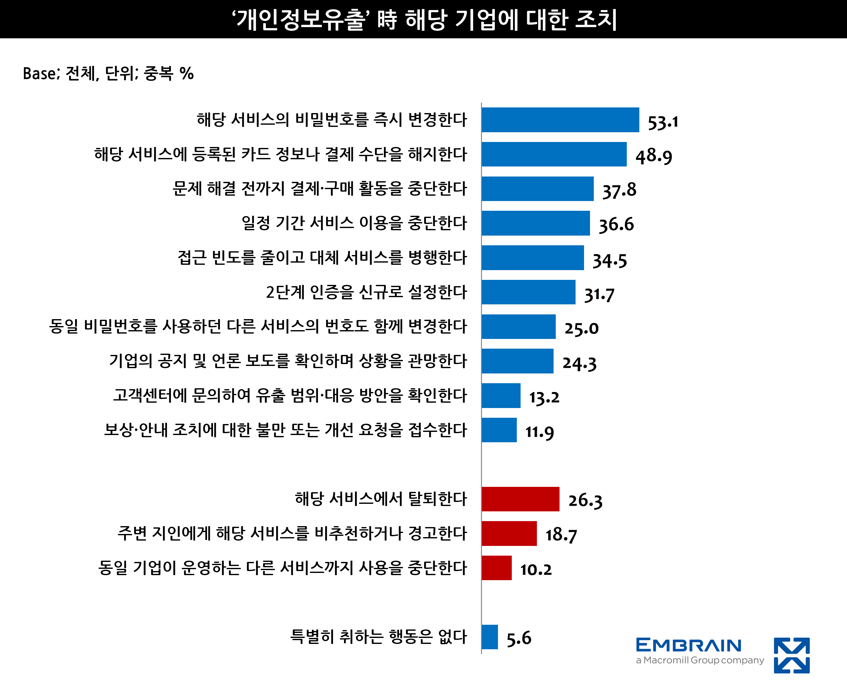 - 정보 유출 時, 비밀번호 변경(53.1%) vs 서비스 탈퇴(26.3%)