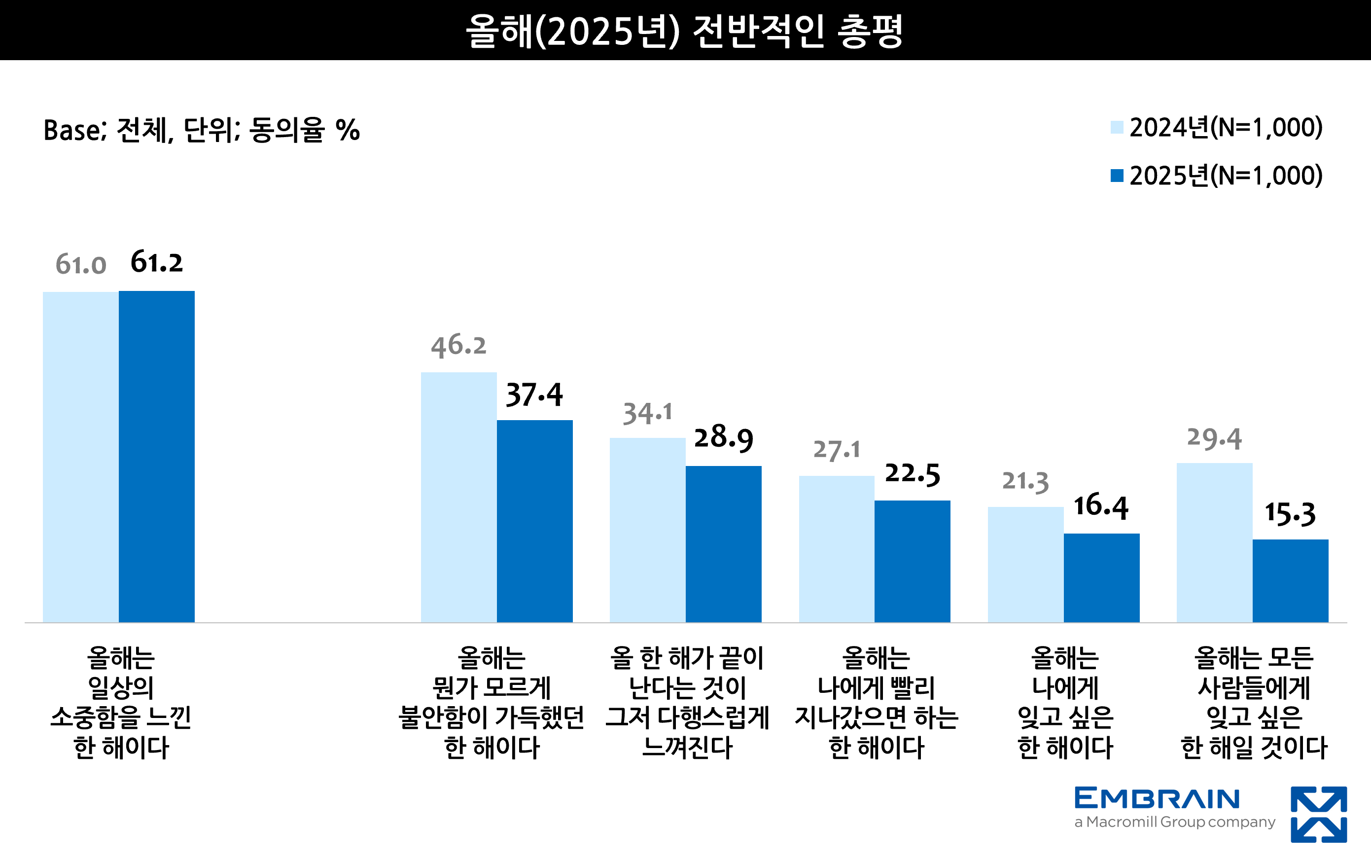 → 시장조사전문기업 엠브레인 트렌드모니터(trendmonitor.co.kr)가 전국 만 19세~59세 직장인 남녀 1,000명을 대상으로 ‘2025 연말 분위기 및 연말 계획 관련 조사’를 실시한 결과, 올 한 해(2025년)는 평안하고 무탈한 ‘일상’을 보낼 수 있었다는 점에서 만족도가 높게 평가되고 있었고, 작년에 비해 불안함 등 부정적인 감정을 느끼는 경우가 줄어들고 있는 것으로 조사되었다. 특히, 내년에는 올해보다 조금 더 나은 해가 될 것이라는 기대감이 큰 모습까지 살펴볼 수 있었다.