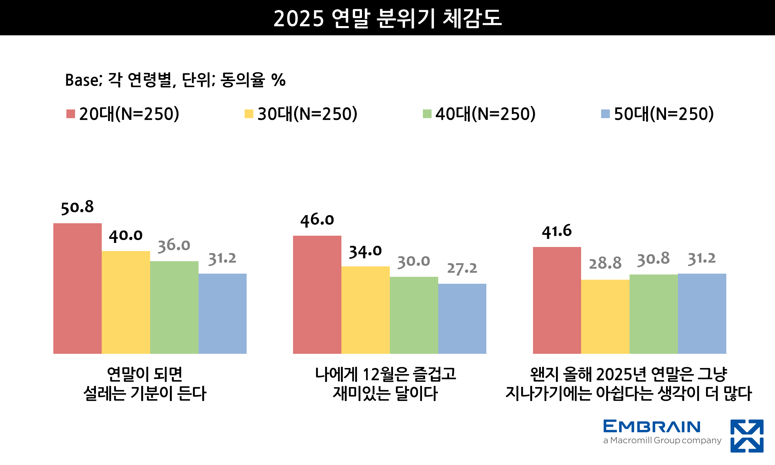 → 전반적으로 ‘연말’이 되더라도 특별한 감정을 느끼지 않는다(56.6%(2024) → 59.6%(2025))는 인식이 소폭 강해지는 모습을 보였으나, 작년과 비교했을 때 연말 분위기를 체감하는 정도가 오히려 높아진 점이 눈에 띄었다. 요즘은 연말이 연말 같지 않고(61.1%(2024) → 55.7%(2025)), 작년보다도 연말 분위기가 왠지 나아진 것 같지 않다(52.8%(2024) → 39.9%(2025))는 응답이 이전 조사 대비 크게 감소한 것으로, 어느 정도 연말 특유의 분위기를 체감하고 있는 모습이었다. 특히, 20대 저연령층을 중심으로 연말이 되면 설레는 감정을 느끼는 경우가 많은 편이었고(20대 50.8%, 30대 40.0%, 40대 36.0%, 50대 31.2%), 12월을 즐겁고 재미있는 달(20대 46.0%, 30대 34.0%, 40대 30.0%, 50대 27.2%)로 받아들이는 경향이 강한 특징을 보였다. 나아가 올해 연말은 그냥 지나가기에 아쉽다는 생각이 더 많다(20대 41.6%, 30대 28.8%, 40대 30.8%, 50대 31.2%)는 응답이 타 연령층 대비 높게 평가되는 등 연말을 보다 의미있게 보내고자 하는 니즈가 두드러지는 편이었다. 또한 이들 세대는 연말을 떠올릴 때 ‘따뜻함’(20대 29.6%, 30대 26.4%, 40대 18.8%, 50대 17.6%), ‘설렘’(20대 26.8%, 30대 20.4%, 40대 13.2%, 50대 12.8%)과 같은 이미지를 주로 연상하는 등 ‘연말’ 자체에 대한 전반적인 호감도가 높은 모습을 확인할 수 있었다. 이는 향후 젊은 층을 중심으로 연말을 보다 적극적으로 즐기고자 하는 니즈가 강화될 수 있음을 예상해볼 수 있는 대목이었다. 반면 고연령층은 이번 연말 역시 지난 해처럼 한 해를 차분하게 정리하는 시간을 가질 계획이라고 응답한 비율이 높게 나타나(20대 62.0%, 30대 62.0% 40대 68.0%, 50대 79.2%), 들뜬 분위기보다는 지난 시간을 돌아보고, 한 해를 마무리하는 데 의미를 두고 있음을 짐작해 볼 수 있었다.