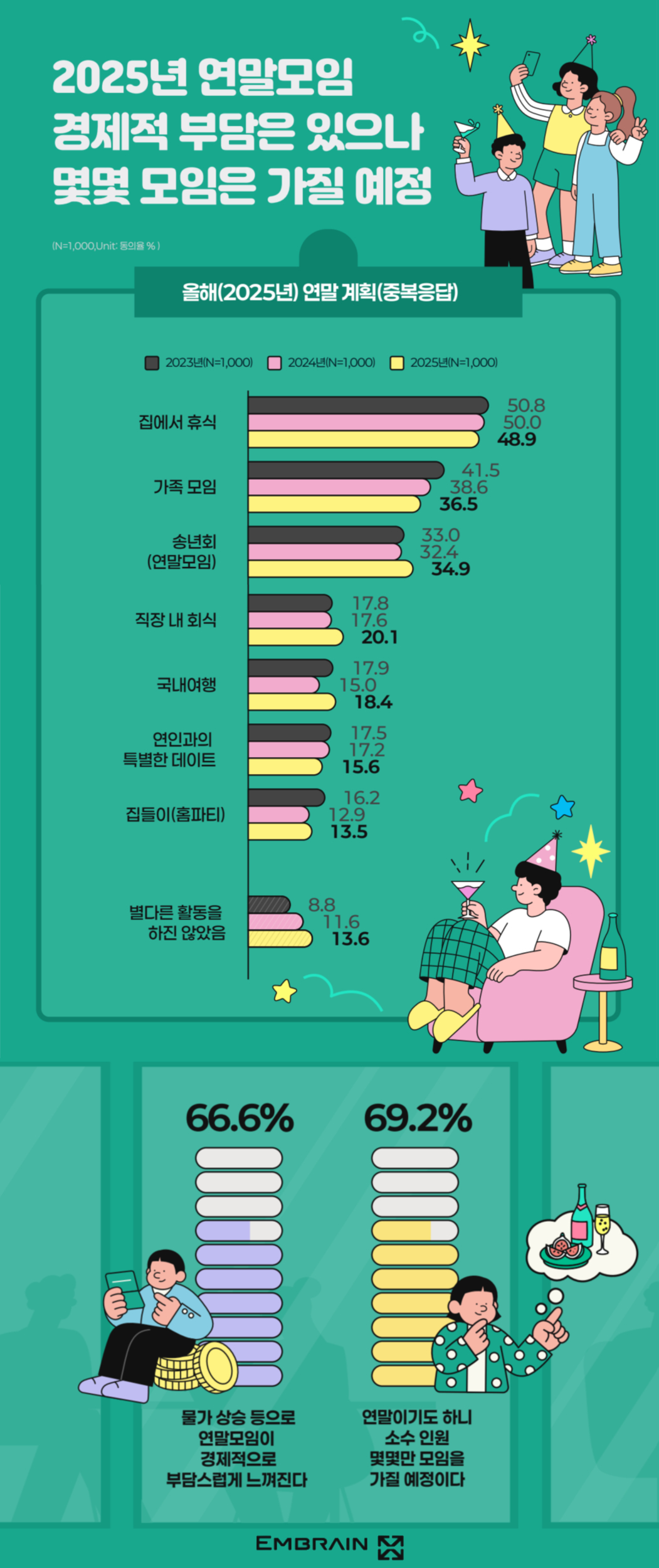→ 한편, 이번 연말에는 그동안 연락이 뜸했던 사람들에게 연말 인사를 건네 볼 생각(34.7%(2023) → 26.0%(2024) → 23.6%(2025))이란 응답이 이전 조사 대비 소폭 감소한 결과를 보일 정도로, ‘연말 인사’의 필요성이 크게 낮아진 모습을 확인할 수 있었다. 또한 올해 연말에는 그동안 잘 하지 못했던 연말 모임을 적극적으로 가져볼 계획이라는 응답이 18.1%에 불과한 결과를 보여, 형식적인 인사나 잦은 모임에 대한 부담감이 여전히 높은 수준임을 짐작해 볼 수 있었다. 단, 연말 모임에 대한 전반적인 니즈가 소폭 회복되는 흐름을 보이고 있는 점은 주목할 만한 변화였다. 올해 연말에는 모처럼 음주를 즐길 생각(29.4%(2024)→ 33.3%(2025))이라는 응답이 이전 조사 대비 한층 높아진 것으로, 특히 몇몇의 소수의 인원과만 모임을 가질 것(61.7%(2024)→ 69.2%(2025))이란 태도가 더욱 뚜렷해진 모습이었다. 아무래도 최근 물가상승으로 연말모임에 대한 경제적 부담감(66.6%, 동의율)이 높아지면서, 관계의 ‘양’보다는 ‘깊이’ 있는 관계에 집중하려는 경향이 강해지고 잇는 것으로 풀이된다.