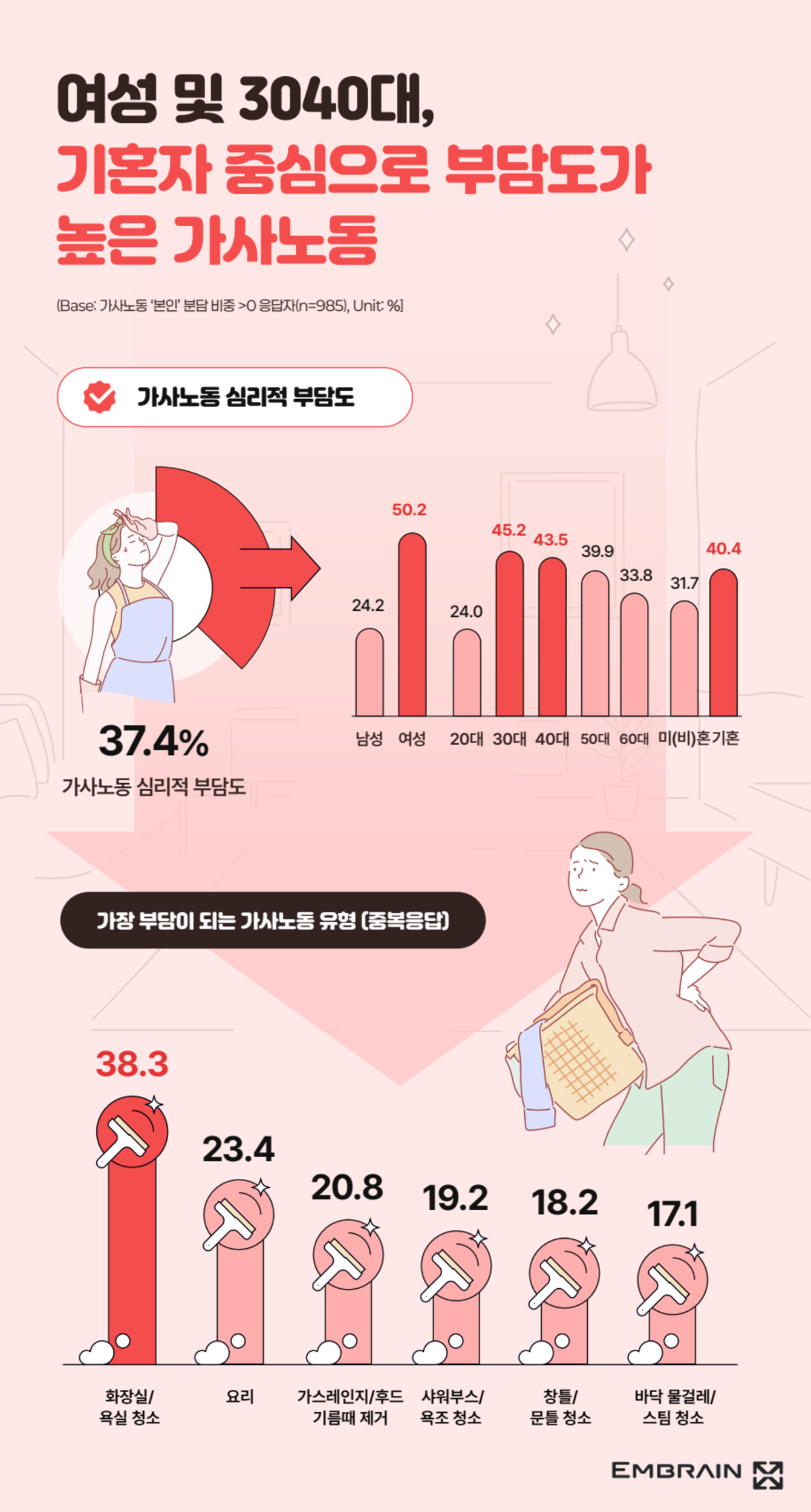 → 시장조사전문기업 엠브레인 트렌드모니터(trendmonitor.co.kr)가 전국 만 19~69세 남녀 1,000명을 대상으로 ‘2025 가사노동 및 가사대행서비스 관련 인식 조사’를 실시한 결과, 가사노동에 대한 부담감이 높아지면서 집안일을 외부 서비스에 맡기려는 인식이 점차 확산되고 있는 것으로 나타났다.