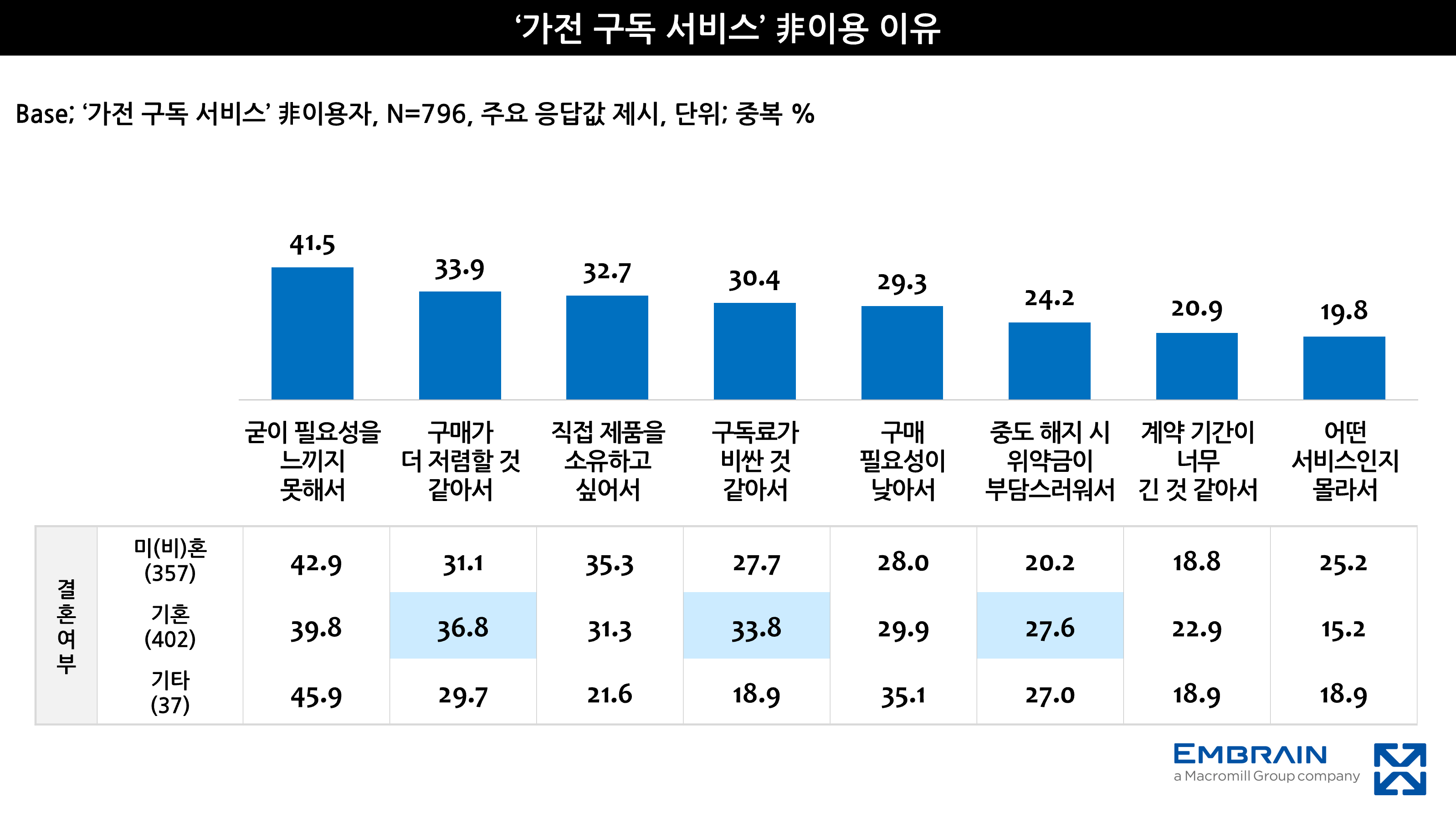 최근 가전 구독 서비스가 TV, 냉장고 등 대형 가전으로 확장되고 있지만, 서비스 전반에 대한 인지도는 아직 낮은 수준에 머물러 있는 것으로 나타났다. 가전 구독 서비스를 ‘자세히 알고 있다’는 응답은 20.4%에 불과했으며, 대체로 ‘알고는 있지만 자세히는 모른다’(63.1%)는 응답이 우세했다. 특히, TV, 냉장고, 세탁기 등 대형 가전을 ‘구독’ 형태로 이용하는 개념 자체를 낯설게 받아들이는 경향이 강했다(68.8%, 동의율). 대형 가전은 한 번 구매하면 오래 사용하는 제품이라는 인식이 강한 만큼, 매달 비용을 내는 구독 방식에 대한 심리적 장벽이 높은 것으로 풀이된다. 실제로 정수기나 공기 청정기처럼 관리가 필요한 생활 가전만 구독으로 이용하는 것이 적절하다(66.4%, 동의율)는 인식이 뚜렷했다. 이러한 인식은 실제 이용 경험률에서도 살펴볼 수 있었다. 현재 가전 구독 서비스를 이용 중인 응답자 비율은 11.1%에 그쳤으며, 아직은 일부 소비자를 중심으로 제한적으로 활용되고 있었다. 서비스를 이용하지 않은 이유로는 ‘굳이 필요성을 느끼지 못했다’(41.5%, 중복응답)는 응답이 가장 많았고, ‘그냥 구매하는 것이 더 저렴할 것 같다’(33.9%), ‘구독보다는 직접 제품을 소유하고 싶다’(32.7%)는 응답이 그 뒤를 이었다. 특히, 기혼자를 중심으로 가격 측면의 부담감이 높았는데(하단 그래프 참조), 가정 단위로 가전을 장기간 사용하는 경우가 많아, 월 단위 비용에 대한 부담이 크게 작용한 것으로 보인다. 실제로 가전 구독 서비스를 이용하다 중단한 이유로도 ‘오히려 비용이 더 많이 든다’(24.7%, 중복응답), ‘월 납부 금액이 비싸다'(18.3%)는 응답이 많았다. 전반적으로 구독 서비스에 대한 가격 민감도가 높은 만큼, 대중 소비자가 수용할 수 있는 적정 가격대를 형성하는 것이 구독 서비스 시장 성장의 핵심 과제가 될 것으로 전망된다.