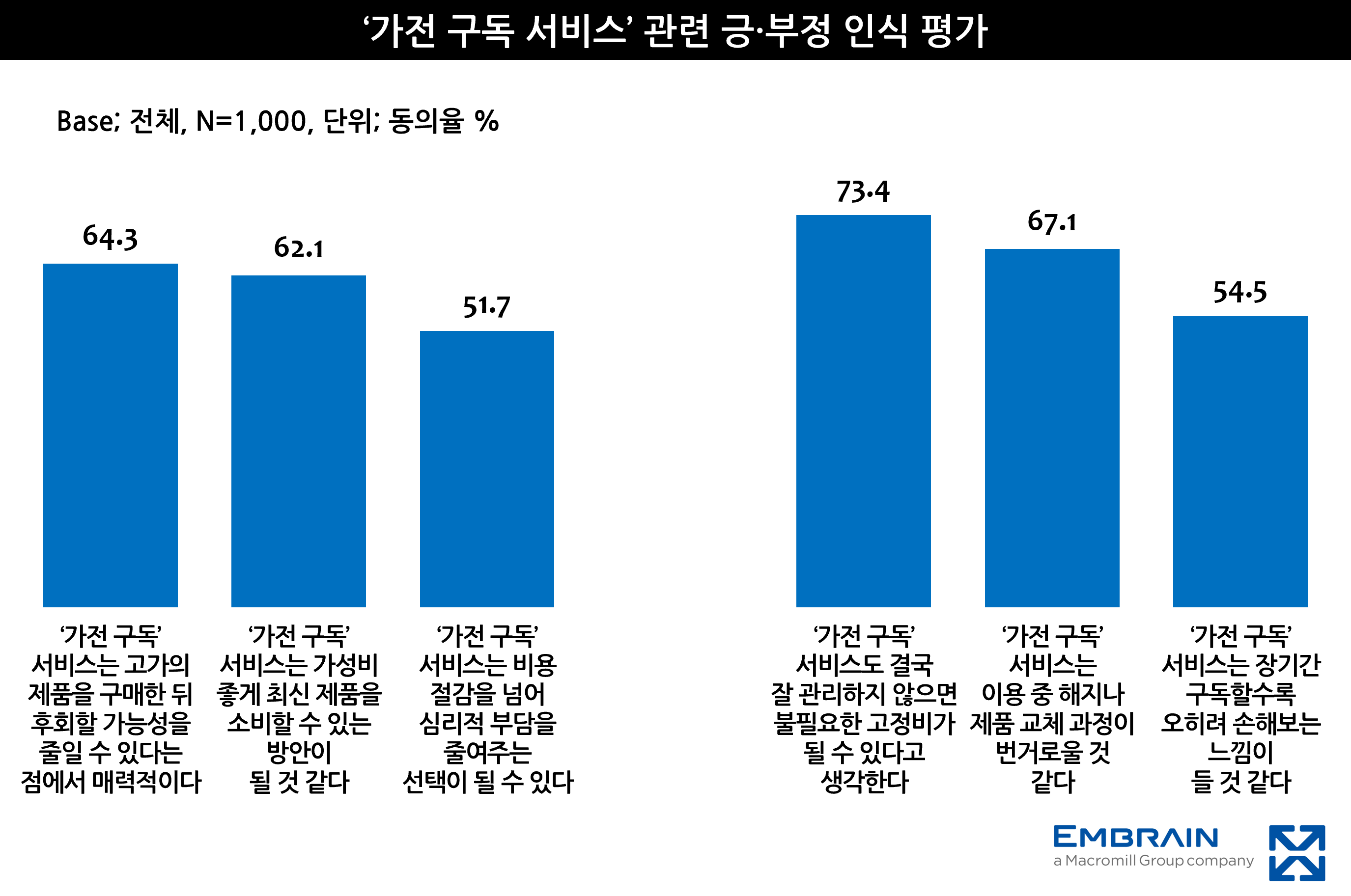 → 시장조사전문기업 엠브레인 트렌드모니터(trendmonitor.co.kr)가 전국 만 19~69세 성인 남녀 1,000명을 대상으로 ‘가전 구독 서비스 관련 U&A 조사’를 실시한 결과, 월 이용료로 정기적인 가전 케어 서비스를 받을 수 있는 ‘가전 구독 서비스’가 관리 편의성과 비용 부담 완화 측면에서 합리적인 선택지로 인식되고 있는 것으로 나타났다. 다만 서비스 인지도와 이용 경험률은 여전히 낮은 수준이며, 불필요한 고정비로 이어질 수 있다는 우려도 함께 확인됐다.