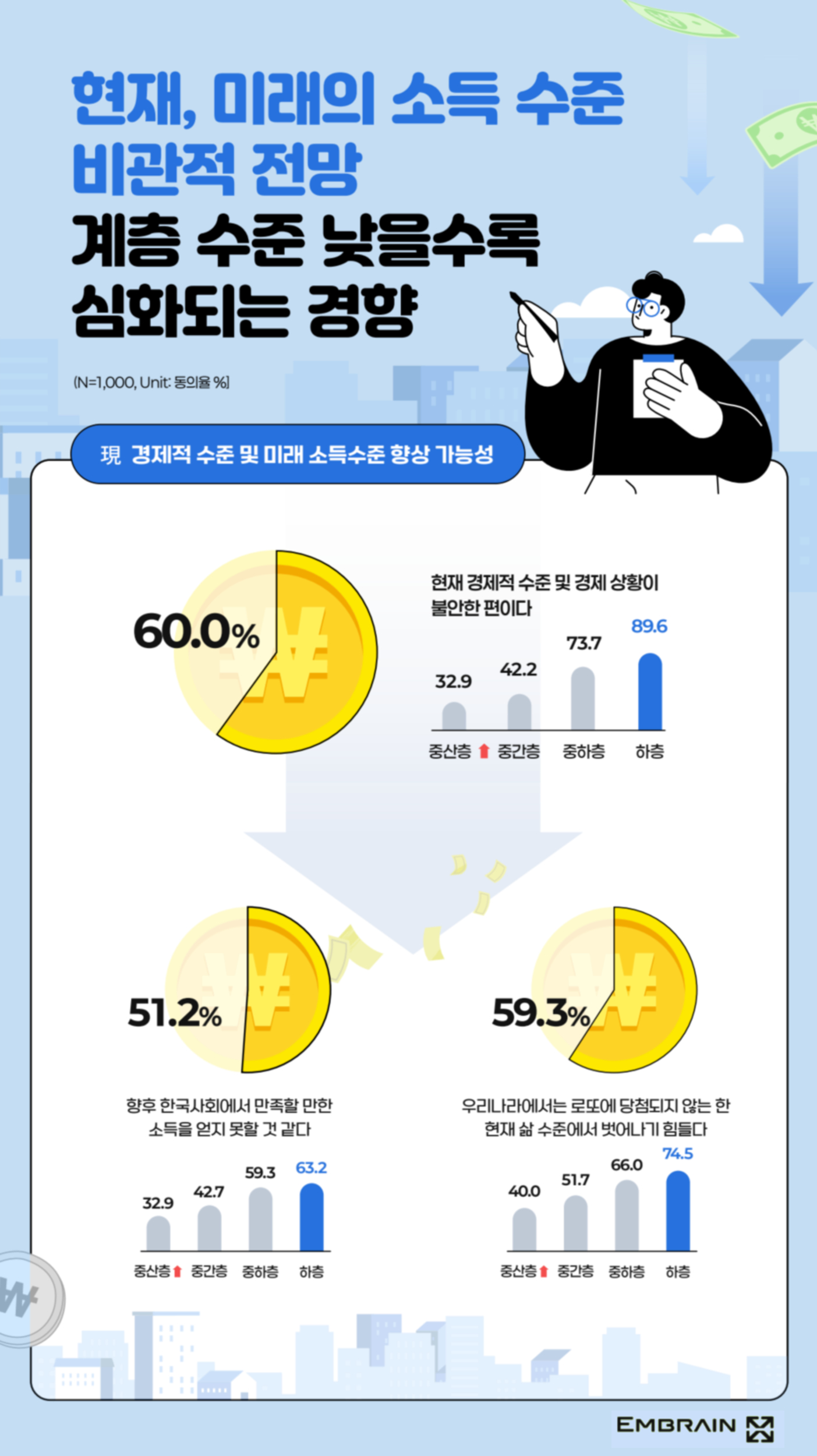 → 올해(2026년) 소득이 작년과 비슷한 수준에 머물 것이라는 전망(44.3%)이 우세한 가운데, 실질 소비 여력 역시 작년과 유사할 것 같다(42.0%)는 응답이 다수를 차지했다. 소득 증가에 대한 기대가 크지 않은 탓인지, 현재 자신의 경제 상황에 대한 불안도도 비교적 높게 평가되고 있었다(불안한 편 60.0%, 보통 23.0%, 불안하지 않은 편 17.0%). 특히 스스로의 계층 수준을 낮게 평가한 응답자일수록 불안도가 크게 높아지는 경향이 두드러졌다(중상층 이상 32.9%, 중간층 42.2%, 중하층 73.7%, 하층 89.6%). 이들은 향후 만족할 만한 소득을 얻기 어려울 것 같다(중상층 이상 32.9%, 중간층 42.7%, 중하층 59.3%, 하층 63.2%)는 데에도 높은 공감을 보였으며, 로또에 당첨되지 않는 한 현재 삶의 수준에서 벗어나기 힘들다(중상층 이상 40.0%, 중간층 51.7%, 중하층 66.0%, 하층 74.5%)는 인식도 자가계층 고평가자 대비 뚜렷하게 나타났다. 경제적 여유의 차이가 현재의 재정 상황뿐 아니라, 미래에 대한 기대감에까지 영향을 미치고 있다는 점에서 주목할만한 결과다.