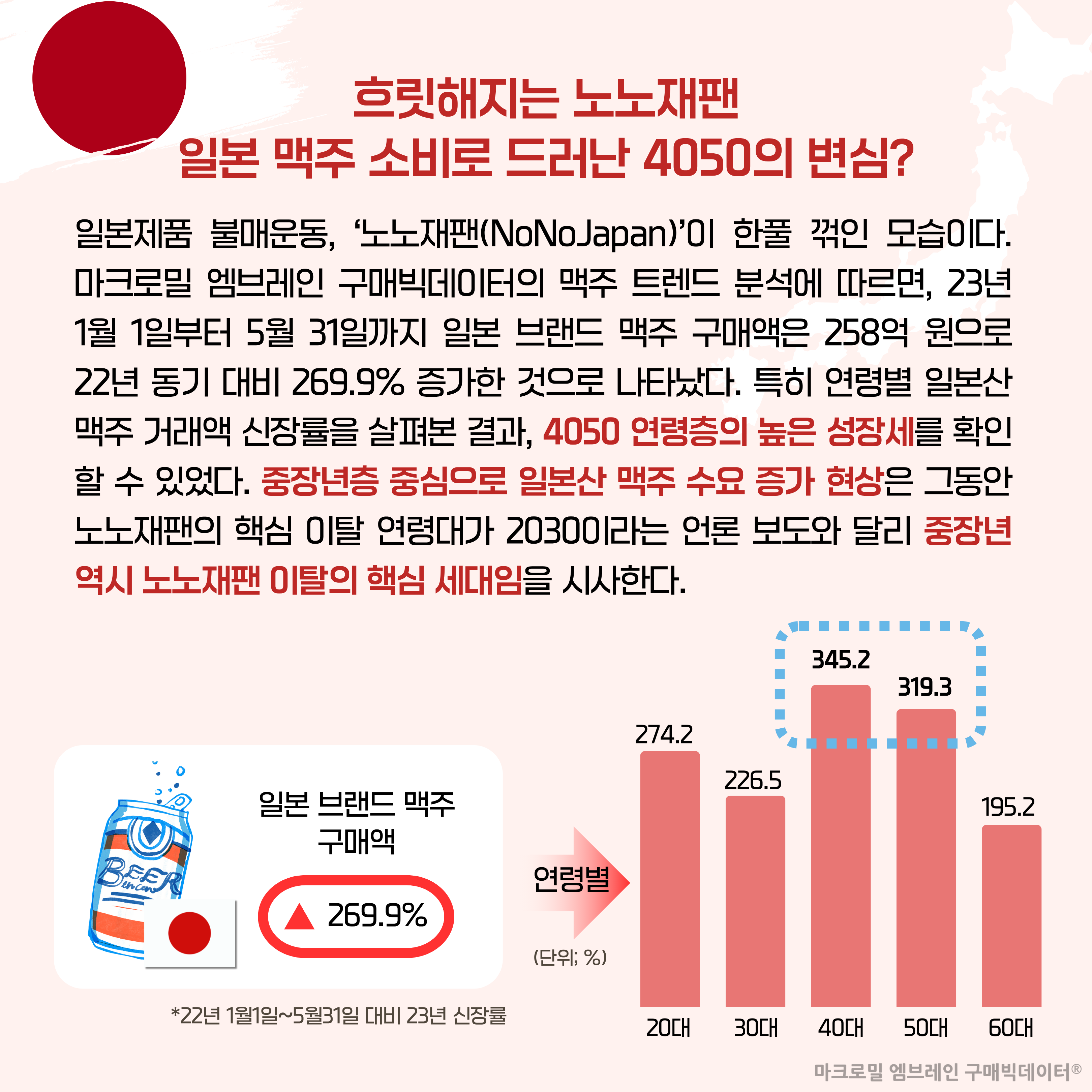 → 일본제품 불매운동, ‘노노재팬(NoNoJapan)’이 한풀 꺾인 모습이다. 마크로밀 엠브레인 구매빅데이터[1](소비자 영수증 분석)의 맥주 트렌드 분석에 따르면, 23년 1월 1일부터 5월 31일까지 일본 브랜드 맥주 구매액은 258억 원으로 22년 동기(2022년 1월~5월) 대비 269.9% 증가한 것으로 나타났다. 특히 연령별 일본산 맥주 거래액 신장률을 살펴본 결과, 4050 연령층이 각각 345.2%, 319.3%로 높은 성장세를 보였고, 이어 20대(274.2%), 30대(226.5%), 60대(195.2%) 순으로 구매액 증가폭을 보였다. 중장년층을 중심으로 일본산 맥주 수요가 높아지고 있음을 알 수 있는 결과로, 그동안 노노재팬의 핵심 이탈 연령대가 2030이라는 다양한 보도내용과 달리 중장년층 역시 적잖은 노노재팬 이탈 움직임을 보이고 있음을 짐작해볼 수 있었다.