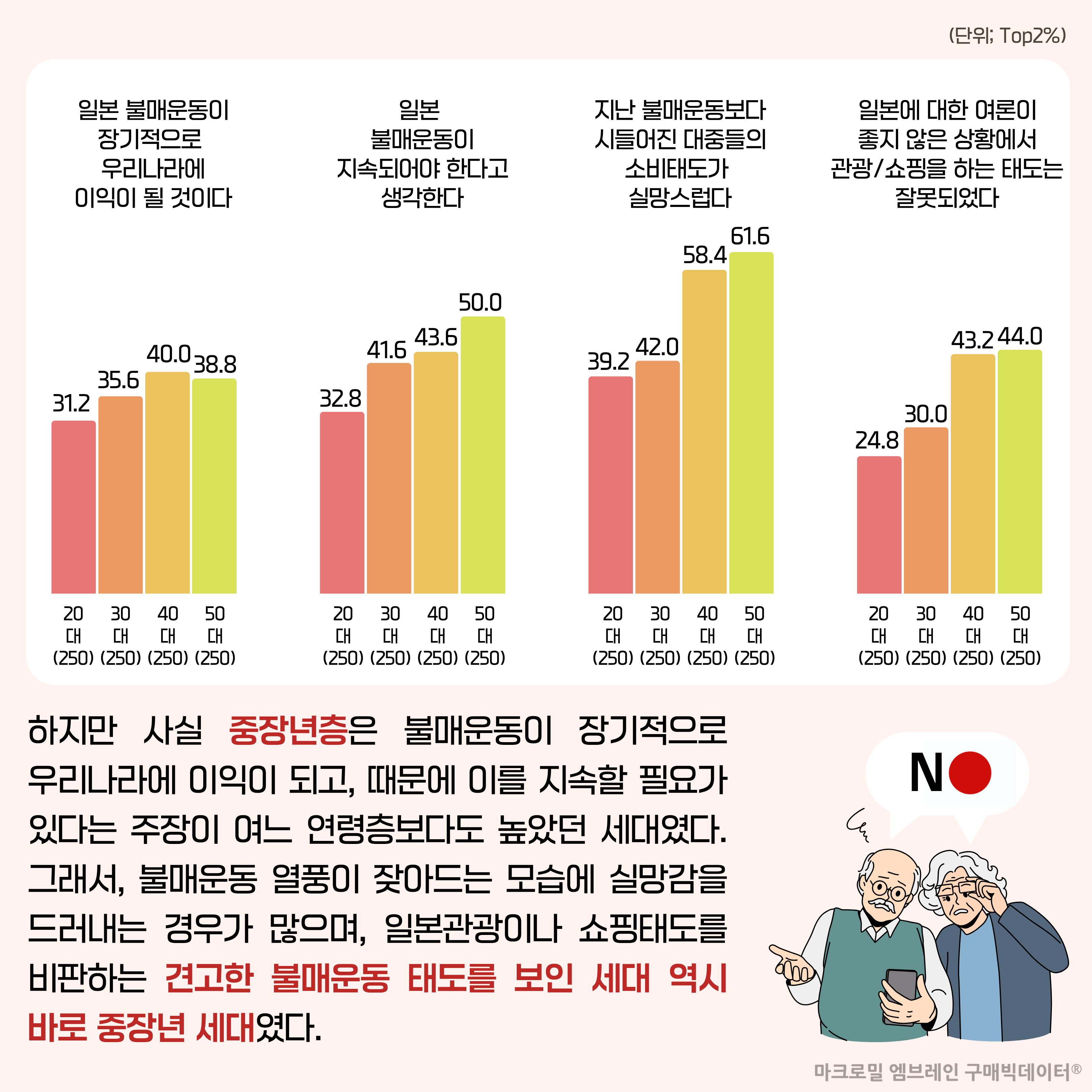 → 이 같은 중장년층의 움직임은 일본제품 불매운동이 한창이던 지난 2020년~2022년과 비교해보면 뚜렷하게 달라진 태도임을 확인할 수 있다. 2022년 12월에 진행한 엠브레인 트렌드모니터(trendmonitor.co.kr)의 ‘일본제품 불매운동 및 일본 여행 니즈 관련 조사’ 결과에 의하면, 중장년층의 경우 불매운동이 장기적으로 우리나라에 이익이 되고(20대 31.2%, 30대 35.6%, 40대 40.0%, 50대 38.8%), 때문에 이를 지속할 필요가 있다(20대 32.8%, 30대 41.6%, 40대 43.6%, 50대 50.0%)는 주장이 여느 연령층보다도 높은 특징을 보였다. 그 결과, 어떤 연령대보다 불매운동 열풍이 잦아드는 모습에 실망감을 드러내고(20대 39.2%, 30대 42.0%, 40대 58.4%, 50대 61.6%), 일본관광이나 쇼핑 태도를 비판(20대 24.8%, 30대 30.0%, 40대 43.2%, 50대 44.0%)하는 목소리가 강할 만큼 견고한 불매운동 태도를 보인 바 있다. 하지만 노노재팬 캠페인이 어느 덧 4년 차에 접어든 2023년 현재 시점에서 4050 연령층은 이전과는 사뭇 달라진 움직임을 보이고 있음을 이번 엠브레인 구매빅데이터 결과로 어느 정도 확인해 볼 수 있었다.