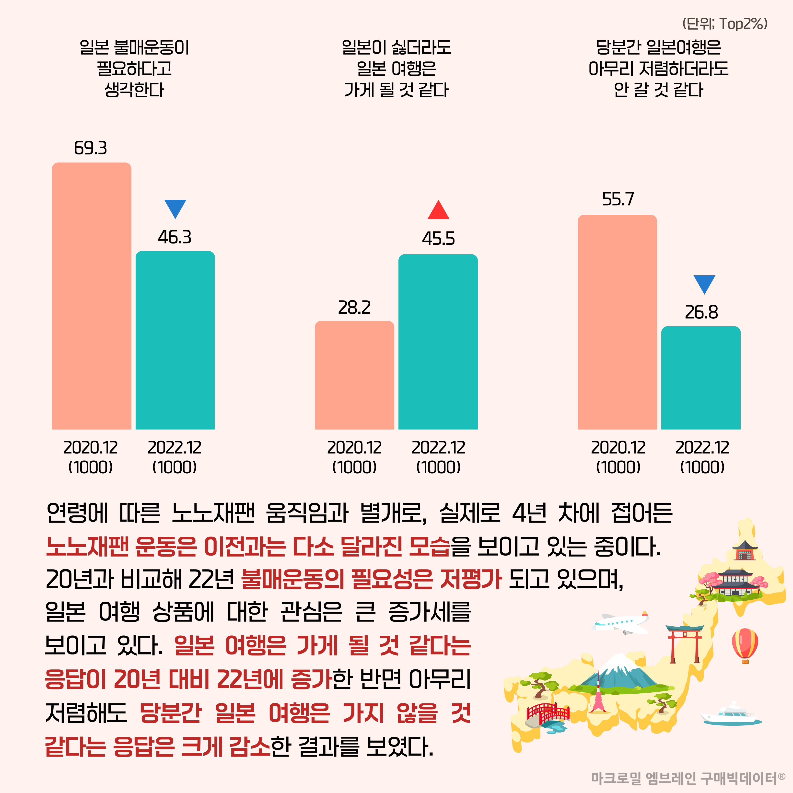 → 연령에 따른 노노재팬 움직임과 별개로, 실제로 4년 차에 접어든 노노재팬 운동은 이전과는 다소 달라진 모습을 보이고 있는 중이다. 2020년과 비교해 불매운동의 필요성(69.3%(2020) → 46.3%(2022))은 저평가되고 있으며, 일본 여행 상품에 대한 관심은 큰 증가세를 보이고 있다. (일본이 싫더라도) 일본 여행은 가게 될 것 같다는 응답이 이전 대비 증가(28.2%(2020) → 45.5%(2022))한 반면 아무리 저렴해도 당분간 일본 여행은 가지 않을 것 같다는 응답은 크게 감소(55.7%(2020) → 26.8%(2022))한 결과를 보일 정도다. 불매운동이 수그러들면서 자연스레 일본산 맥주, 일본 여행 등의 수요가 증가하고 있는 만큼 향후 일본 제품의 영향력은 이전과는 다른 양상으로 전개될 것으로 예상된다.