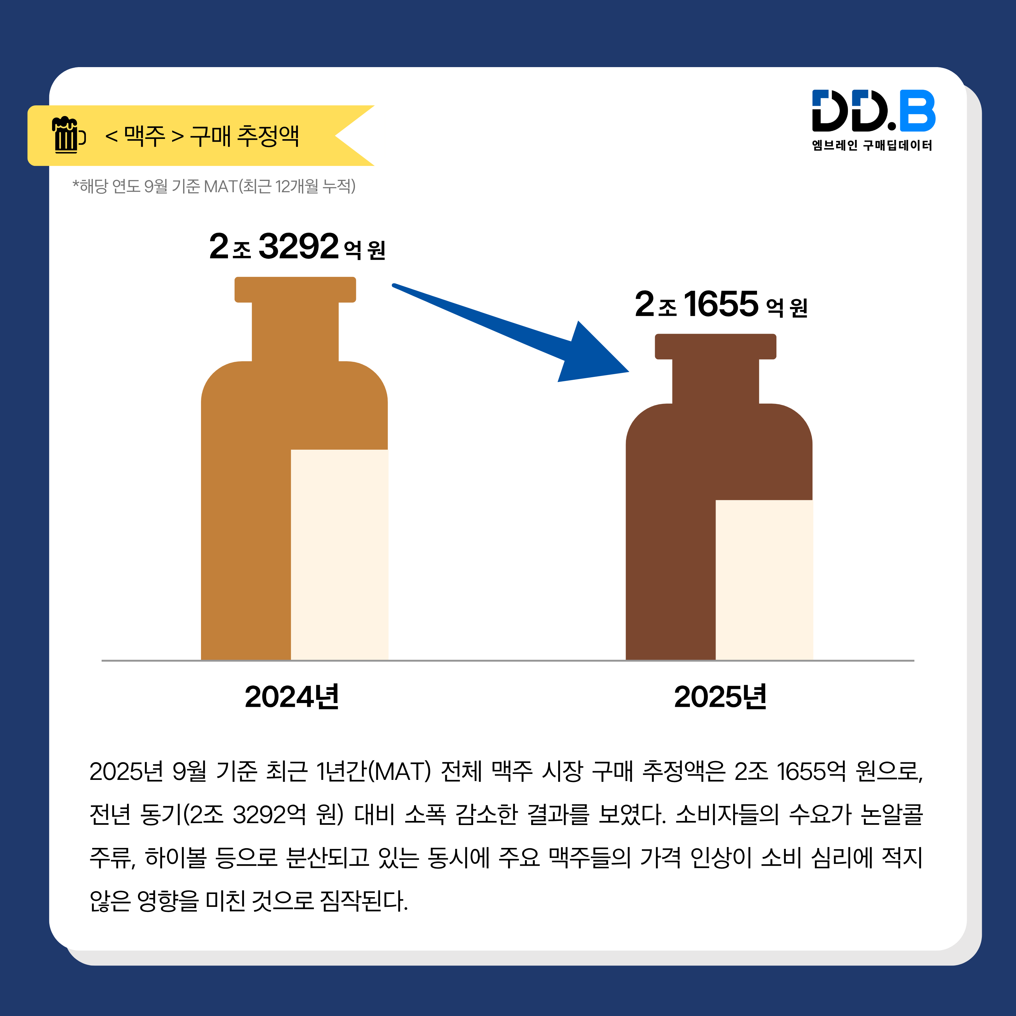 → 엠브레인 딥데이터®[1]의 구매 트렌드 분석에 따르면, 최근 맥주 시장 전반의 성장세가 잠시 주춤한 가운데 ‘고도수’ 맥주가 빠르게 존재감을 넓혀가고 있는 것으로 확인됐다. 우선, 2025년 9월 기준 최근 1년간(MAT) 전체 맥주 시장 구매 추정액은 2조 1655억 원으로, 전년 동기(2조 3292억 원) 대비 소폭 감소한 결과를 보였다. 소비자들의 수요가 논알콜 주류, 하이볼 등으로 분산되고 있는 동시에, 주요 맥주 제품 가격 인상에 대한 부담감이 어느정도 영향을 미친 것으로 짐작된다.