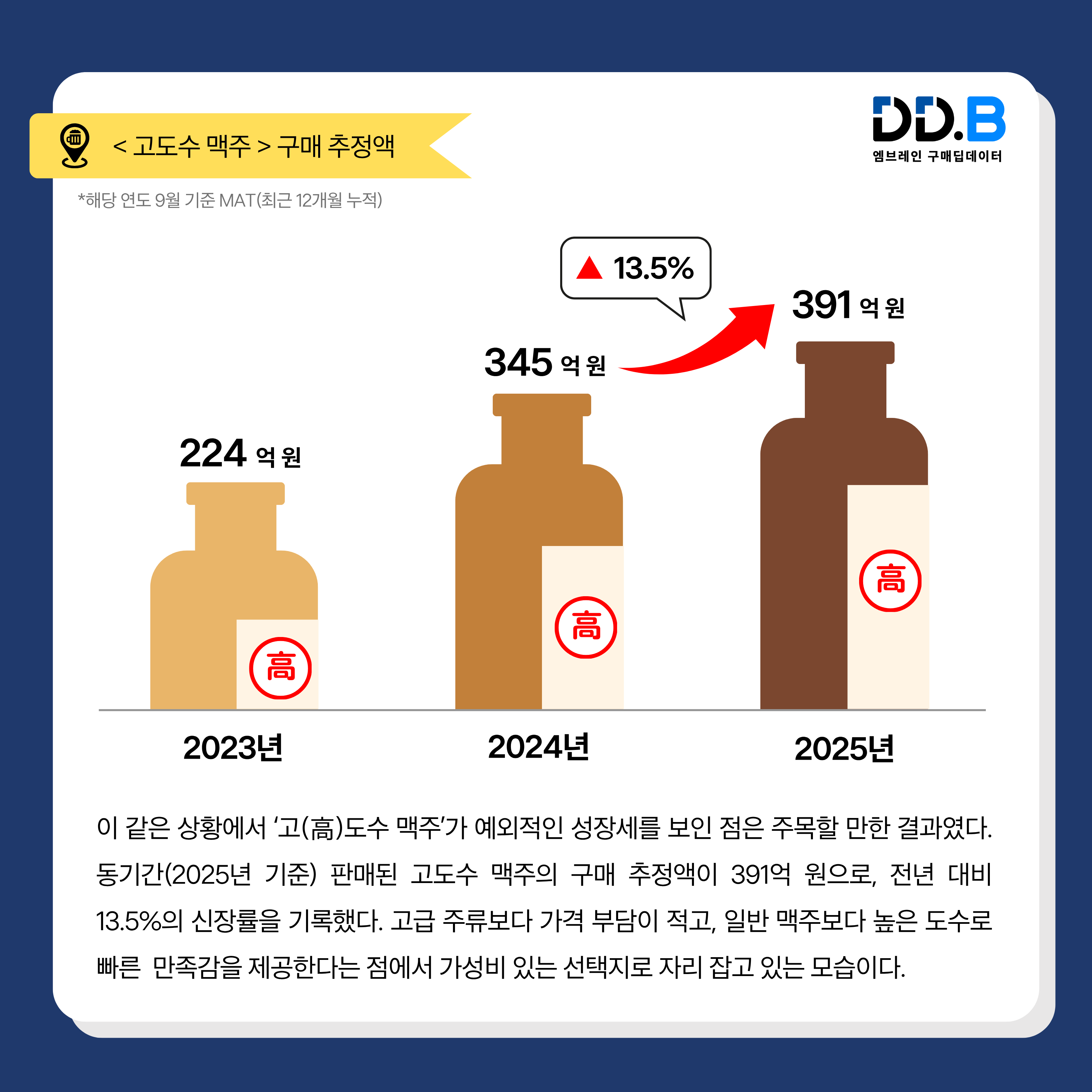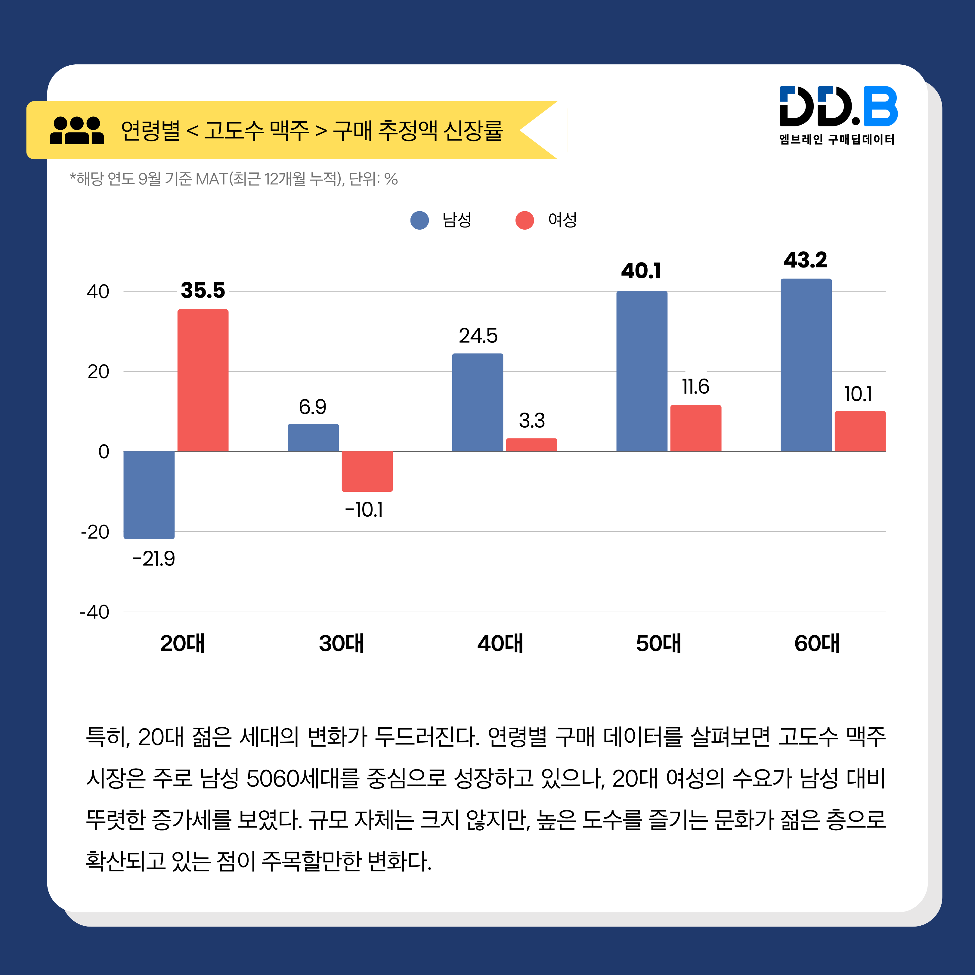 그럼에도 ‘고(高)도수 맥주’가 예외적인 성장세를 보인 점은 주목할 만한 결과였다. 같은 기간(2025년 기준) 판매된 고도수 맥주의 구매 추정액은 391억 원으로, 전년 대비 13.5%의 신장률을 기록했다. 경기 침체로 전체 주류 소비가 위축된 상황에서 고급 주류보다 가격 부담이 적고, 일반 맥주보다 높은 도수로 빠른 만족감을 제공한다는 점에서 가성비 있는 선택지로 자리 잡고 있는 모습이다. 특히, 20대 젊은 세대의 변화가 두드러진다. 연령별 구매 데이터를 살펴보면 고도수 맥주 시장은 주로 남성 5060세대를 중심으로 성장하고 있으나, 20대 여성의 수요가 남성 대비 뚜렷한 증가세를 보였다. 규모 자체는 크지 않지만, 높은 도수를 즐기는 문화가 젊은 층으로 확산되고 있다는 점에서 눈에 띄는 대목이었다.