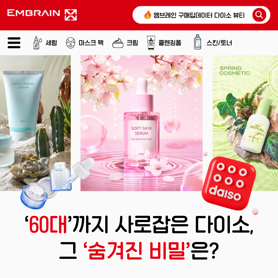 → 최근 다이소의 ‘기초 화장품’ 제품이 뷰티 시장에서 빠르게 영향력을 넓혀가고 있다. 기초제품은 피부에 직접 닿는 만큼 브랜드 화장품을 신뢰하는 경향이 강했으나, 다이소가 합리적인 가격에 높은 퀄리티의 상품을 선보이면서 대중소비자들의 긍정적인 평가를 받고 있기 때문이다. 특히 고가 화장품을 구매하기 전 소용량으로 제품을 효능을 비교 및 체험하고자 하는 니즈가 높아지면서, 다이소의 기초 화장품 라인업이 새로운 선택지로 자리 잡고 있다. 최근에는 국내 제약사까지 다이소 전용 화장품을 출시하며 입점 경쟁에 합류하고 있어, 향후 뷰티 업계의 경쟁은 더욱 치열해질 것으로 전망된다.