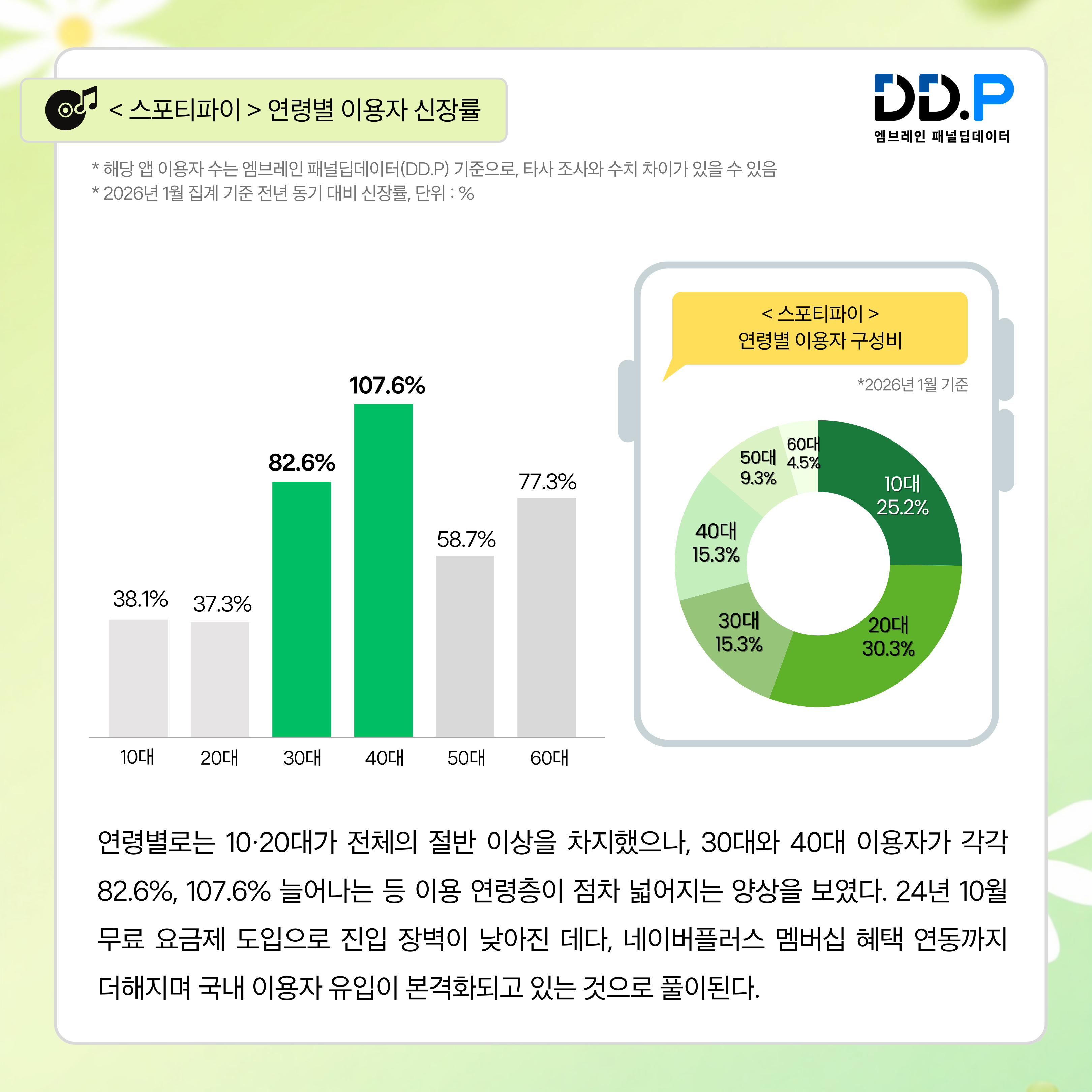 이 가운데 가장 주목할 만한 변화는 스포티파이다. 스포티파이 이용자 수는 전년 동기(2025년 1월) 대비 55.0% 증가(DD.P 패널 기준)하며 주요 플랫폼 중 가장 높은 성장률을 기록했다. 연령별로는 10·20대가 전체의 절반 이상을 차지했으나(10대 25.2%, 20대 30.3%, 30대 15.3%, 40대 15.3%, 50대 9.3%, 60대 4.5%), 30대와 40대 이용자가 각각 82.6%, 107.6% 늘어나는 등 이용 연령층이 점차 넓어지는 양상을 보였다. 2024년 10월 무료 요금제 도입으로 진입 장벽이 낮아진 데다, 네이버플러스 멤버십 혜택 연동까지 더해지며 국내 이용자 유입이 본격화되고 있는 것으로 풀이된다.