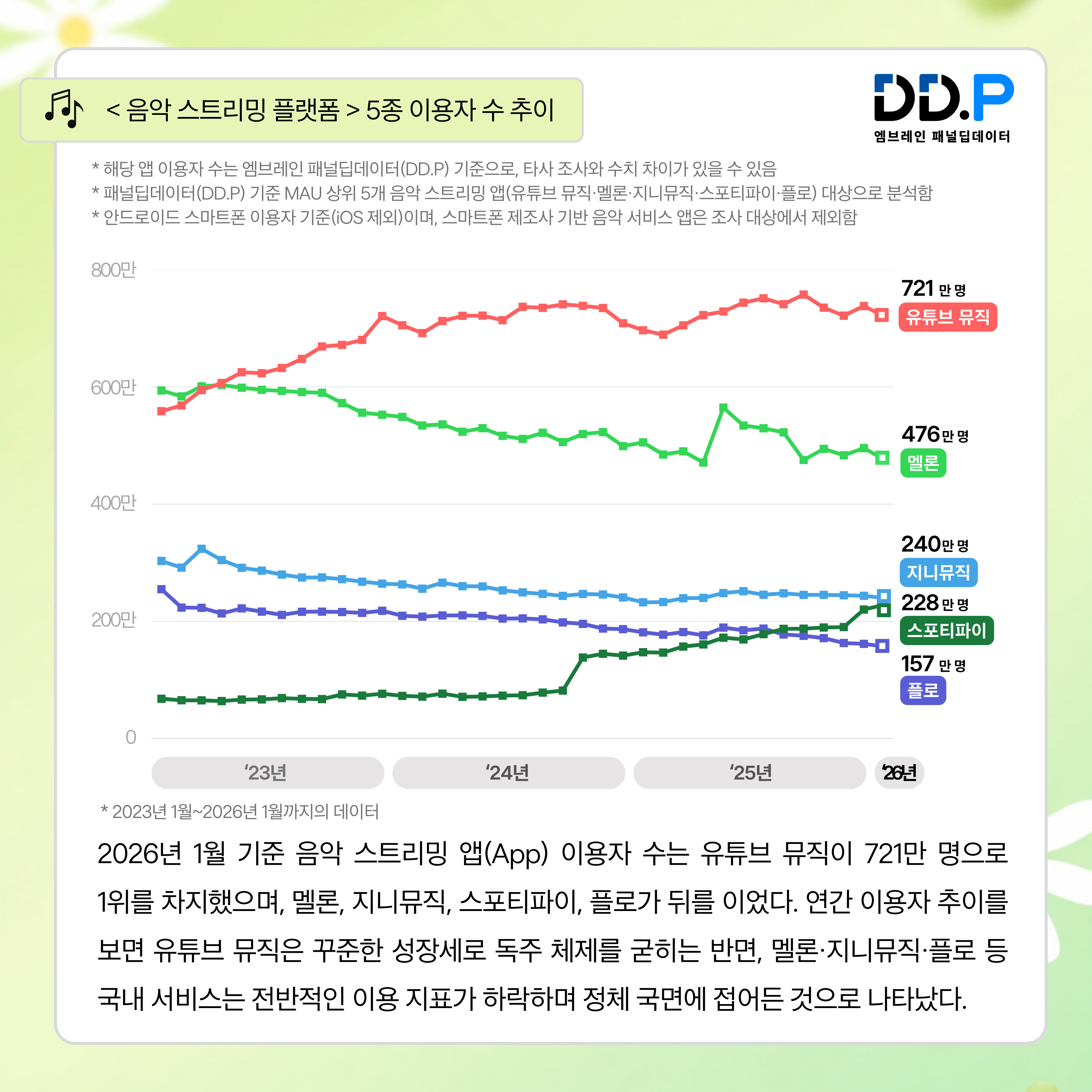 [2] 패널딥데이터(DD.P) 기준 MAU 상위 5개 음악 스트리밍 앱(유튜브 뮤직·멜론·지니뮤직·스포티파이·플로) 대상으로 분석. 안드로이드 스마트폰 이용자 기준(iOS 제외)이며, 스마트폰 제조사 기반 음악 서비스 앱은 조사 대상에서 제외함.