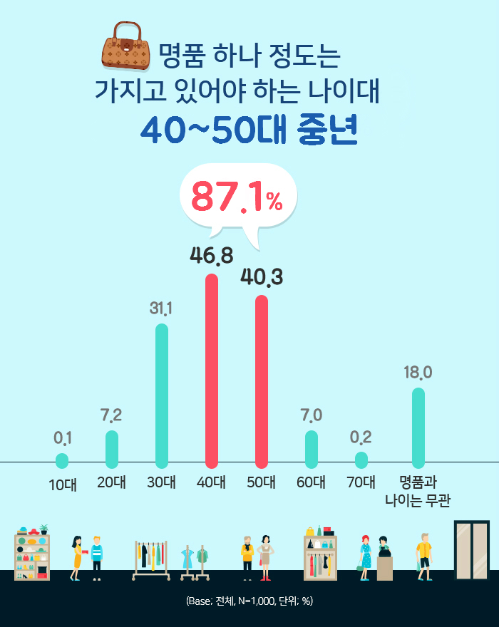 → 다양한 이미지가 고르게 나타난 명품 제품과는 달리 명품 소유자에 대한 인식은 부정적인 색채가 강한 것으로 나타났다. ‘명품으로 자신을 꾸민 사람들’을 보면 드는 생각을 물어본 결과 ‘과시하는’(55%, 중복응답)과 ‘사치스러운’(50.1%)을 이미지로 꼽는 의견이 가장 많았다. 아무래도 명품을 갖고는 싶지만 쉽게 가지기는 어렵다 보니, 명품보다는 명품 소유자에게 부정적인 이미지를 덧씌우는 경향이 있는 것으로 보여진다. 특히 명품으로 치장한 사람은 과시하는 것 같다는 생각은 50대 여성(65.6%)이 많이 하였으며, 30대 남성은 사치스럽다는 평가(60%)를 가장 많이 내리는 소비자층이었다. 그밖에 재력가 같다(47%)는 평가와 함께 허영허세의(45.4%), 고급스러운(36.1%), 졸부 같은(21.2%)의 이미지도 명품 소유자에게 많이 느끼는 편이었다. 명품을 소유할 만한 나이로는 40대(46.8%, 중복응답)를 가장 많이 꼽았으며, 다음으로는 50대(40.3%), 30대(31.1%) 순이었다. 대부분은 자신의 연령대가 명품이 가장 필요한 나이라는 생각을 많이 내비쳤으며, 명품의 소유가 나이와는 상관없다는 의견은 18%에 머물렀다.