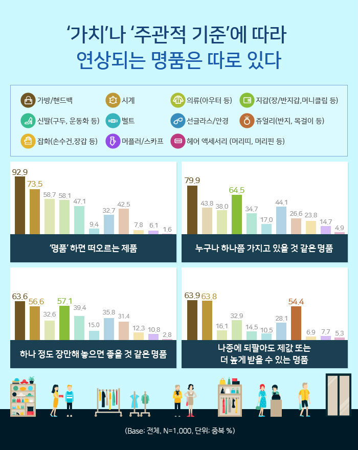 → 흔히 ‘명품’하면 가장 많이 떠올리는 제품은 가방/핸드백(92.9%, 중복응답)과 시계(73.5%) 제품인 것으로 조사되었다. 의류(58.7%)와 지갑(58.1%), 신발(47.1%), 쥬얼리(42.5%), 선글라스/안경(32.7%)을 떠올리는 경우도 적지 않았지만, 대부분은 명품을 떠올릴 때 보통 가방과 핸드백 또는 시계를 생각한다고 볼 수 있다. 누구나 하나쯤 가지고 있을 것 같은 명품 제품으로는 가방/핸드백(79.9%, 중복응답)과 함께 지갑(64.5%)을 주로 꼽았으며, 그 다음으로는 선글라스/안경(44.1%)과 시계(43.8%)를 누구나 하나쯤 가지고 있을 것 같은 명품 제품으로 많이 바라봤다. 하나 정도는 장만해 놓으면 좋을 것 같은 제품으로는 가방/핸드백(63.6%, 중복응답)과 지갑(57.1%), 시계(56.6%)를 많이 꼽았다. 가방/핸드백과 시계의 경우 나중에 되팔아도 제값 또는 더 높게 받을 수 있으며(가방/핸드백 63.9%, 시계 63.8%), 명품이라서 확실히 품질이 다른 것 같다(가방/핸드백 57.4%, 시계 60.7%)는 인식도 강한 편이었다.
