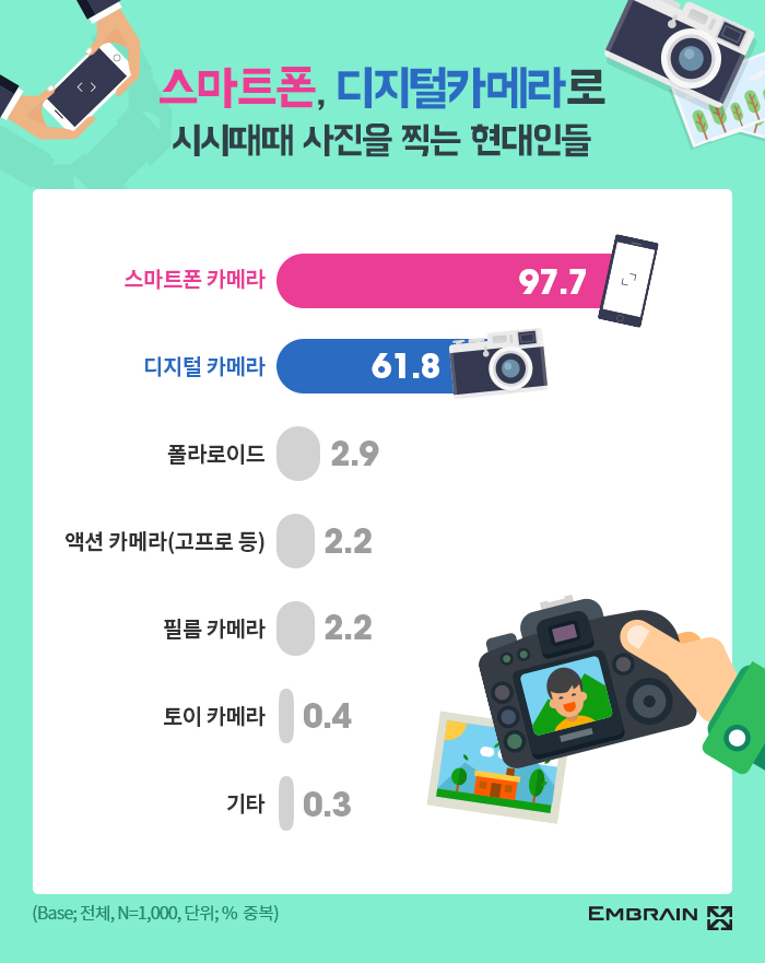 → 시장조사전문기업 엠브레인 트렌드모니터(trendmonitor.co.kr)가 스마트폰을 사용하는 전국 만 19세~59세 성인남녀 1,000명을 대상으로 ‘카메라’ 관련 설문조사를 실시한 결과, 스마트폰에 내장된 카메라의 성능이 크게 향상되면서, 이제 스마트폰이 기존 디지털 카메라의 역할을 상당부분 대체하고 있는 것으로 조사되었다. 전체 응답자의 97.7%(중복응답)가 평소 사진을 찍을 때 주로 스마트폰을 사용하고 있을 만큼 스마트폰 카메라의 활용도는 매우 높은 수준이었다. 그에 비해 주로 디지털 카메라로 사진을 촬영하는 소비자(61.8%)는 상대적으로 적은 편으로, 휴대가 편리한데다가 최근 성능까지 크게 향상된 스마트폰 카메라에게 밀리기 시작했다는 것을 알 수 있다. 다만 30대의 경우에는 여전히 디지털 카메라의 사용(30대 남성 71.2%, 30대 여성 72%)이 많은 편이었다. 실제 과거에 비해 스마트폰 카메라의 사용 비중이 높아졌다고 느끼는 사람들을 쉽게 찾아볼 수 있었다. 평상시에 주로 스마트폰 카메라를 사용한다고 응답한 소비자 10명 중 7명(68.2%)이 스마트폰 카메라를 예전보다 많이 사용하는 것 같다고 응답한 것이다. 그에 비해 예전과 비슷한 것 같다는 응답은 24.2%, 과거보다는 사용이 줄어들었다는 응답은 7.7%에 그쳐, 전반적으로 스마트폰 카메라의 사용이 크게 증가했다는 것을 보여줬다.
