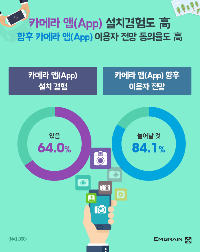 - 전체 64%가 스마트폰에 카메라 앱 이용, 이용자 74.4% “카메라 앱으로 촬영하면 더 예쁘게 사진이 찍히는 것 같아”