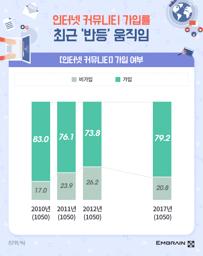 주춤하던 ‘인터넷 커뮤니티’ 가입률 다시 증가(10년 83%→12년 73.8%→17년 79.2%)