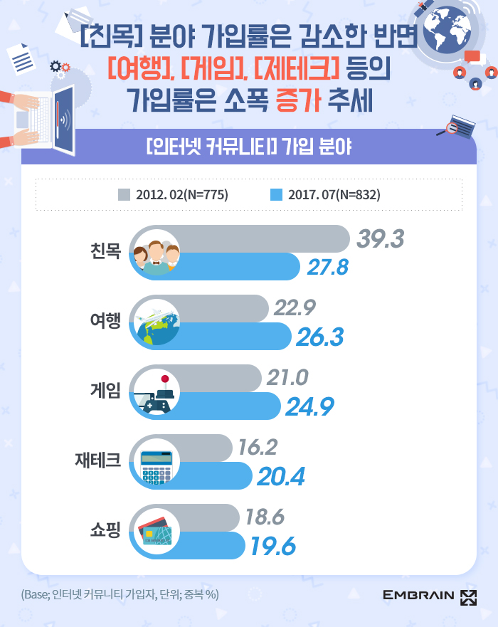 ‘친목’ 커뮤니티 가입자가 가장 많았으나, 예전보다는 감소(12년 39.3%→17년27.8%)
