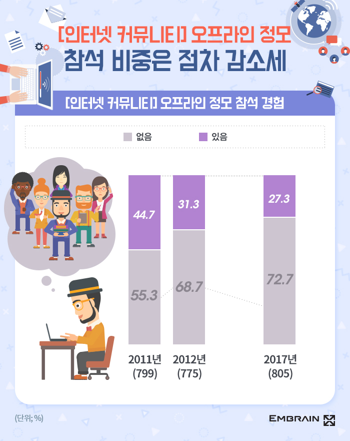 ‘오프라인 모임’ 참석률은 꾸준한 감소 추세(10년 45.1%→17년 27%)