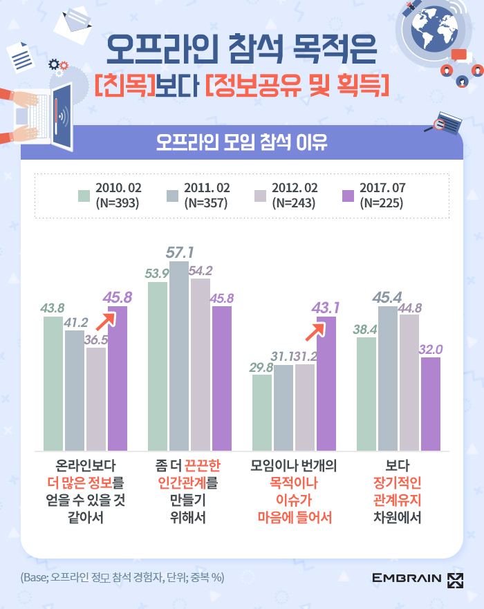 - 오프라인 모임 참석률은 꾸준히 감소(10년 45.1%→17년 27%), 참석자들은 주로 ‘정보획득’과 ‘친목’을 위해 참석