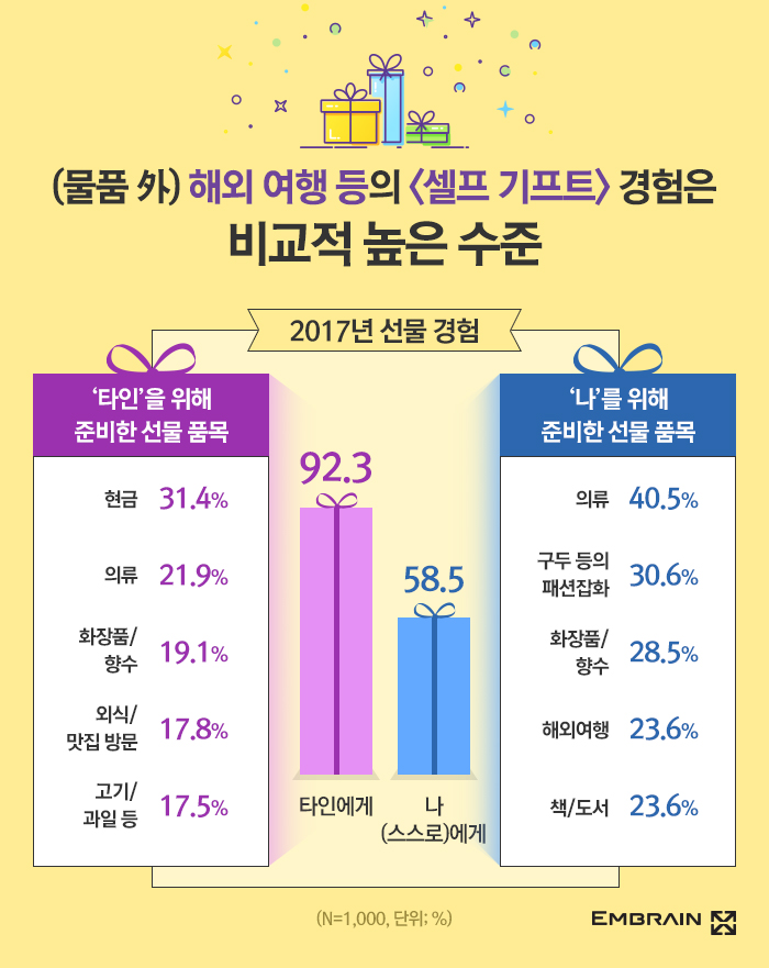 → 주목해볼 부분은 선물의 대상이 ‘타인’에게만 국한되지 않고, ‘나’에게까지 확장되고 있다는 사실이다. 전체 10명 중 6명(58.5%)이 스스로에게 선물을 한 경험이 있다고 밝힐 만큼 ‘셀프 기프팅’이 하나의 선물문화로 자리잡아가는 모습이다. 남성(47.8%)보다는 여성(69.2%), 그리고 젊은 세대(20대 70%, 30대 69.6%, 40대 52.8%, 50대 41.6%)와 미혼자(유자녀 기혼자 48.4%, 무자녀 기혼자 65.3%, 미혼자 70.7%)가 자기 자신을 위해 선물을 구입한 경험이 많은 특징이 매우 뚜렷했다. 자기 자신에게 가장 많이 건네는 선물은 의류(40.5%, 중복응답)로, 모든 연령대(20대 40.6%, 30대 41.4%, 40대 40.2%, 50대 39.4%)에서 비슷한 생각을 가지고 있었다. 의류와 함께 패션잡화(30.6%)와 화장품/향수(28.5%), 해외여행(23.6%), 서적/책(23.6%), 외식(19%)도 자신에게 주는 선물로 많이 꼽혔다. 이 중 해외여행과 외식, 의류의 경우 ‘가치소비’나 ‘욜로’와 같은 최근 소비트렌드에서도 부각되는 소비품목으로, 점점 자신의 만족을 위한 소비를 지향하는 소비자들이 많아지고 있다는 해석을 가능케 한다.