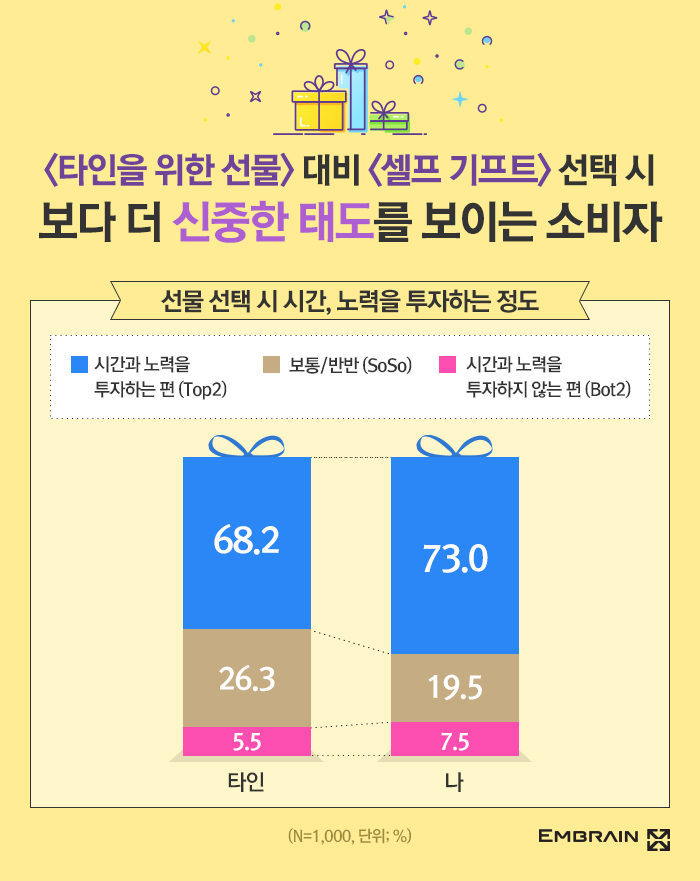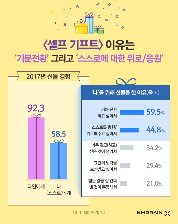 - 스스로에게 선물을 하는 이유는 “기분 전환을 하고 싶고, 스스로를 응원 및 위로해주고 싶어서”