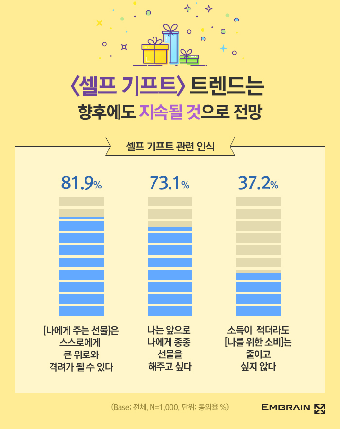 10명 중 8명(81.9%)이 “나를 위한 선물이 스스로에게 큰 위로와 격려가 될 수 있다”는데 공감해