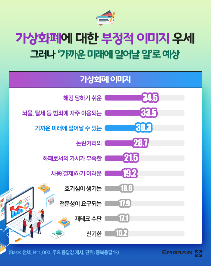 → 한편 ‘화폐 없는 사회’에 대한 논의를 촉발시키는 또 다른 요인으로 ‘가상화폐’의 등장을 꼽을 수 있는데, 먼 미래에는 가상화폐가 대중화될 것이라는 전망을 하면서도 당장 실물화폐를 대체하지는 못할 것이라는 의견이 지배적인 것으로 나타났다. 지폐나 동전과 같은 ‘실물’이 없이 네트워크로 연결된 공간에서 전자적 형태로 사용되는 디지털 화폐의 일종이라고 정의되는 ‘가상화폐’에 대한 이미지는 아직 부정적인 측면이 강한 편이었다. 해킹을 당하기 쉽고(34.5%, 중복응답), 뇌물과 탈세 등 범죄에 자주 이용된다(33.5%)는 인식이 가장 강한 것으로, 눈으로 확인하기 어렵고, 네트워크 상으로 거래되는 가상화폐에 대한 불안감이 크다는 것을 보여준다. 물론 가까운 미래에 나타날 것(30.3%)이라며, 가상화폐의 도래가 곧 다가올 것이라는 의견도 적지 않았다. 하지만 전반적으로는 아직 논란거리(28.7%)이며, 화폐로서의 가치가 부족하고(21.5%), 사용 및 결제가 어렵다(19.2%)는 부정적 인식이 크다는 점에서, 대중적인 이용이 이뤄지기까지는 상당한 시간이 필요할 것이라는 예상이 가능해 보인다.