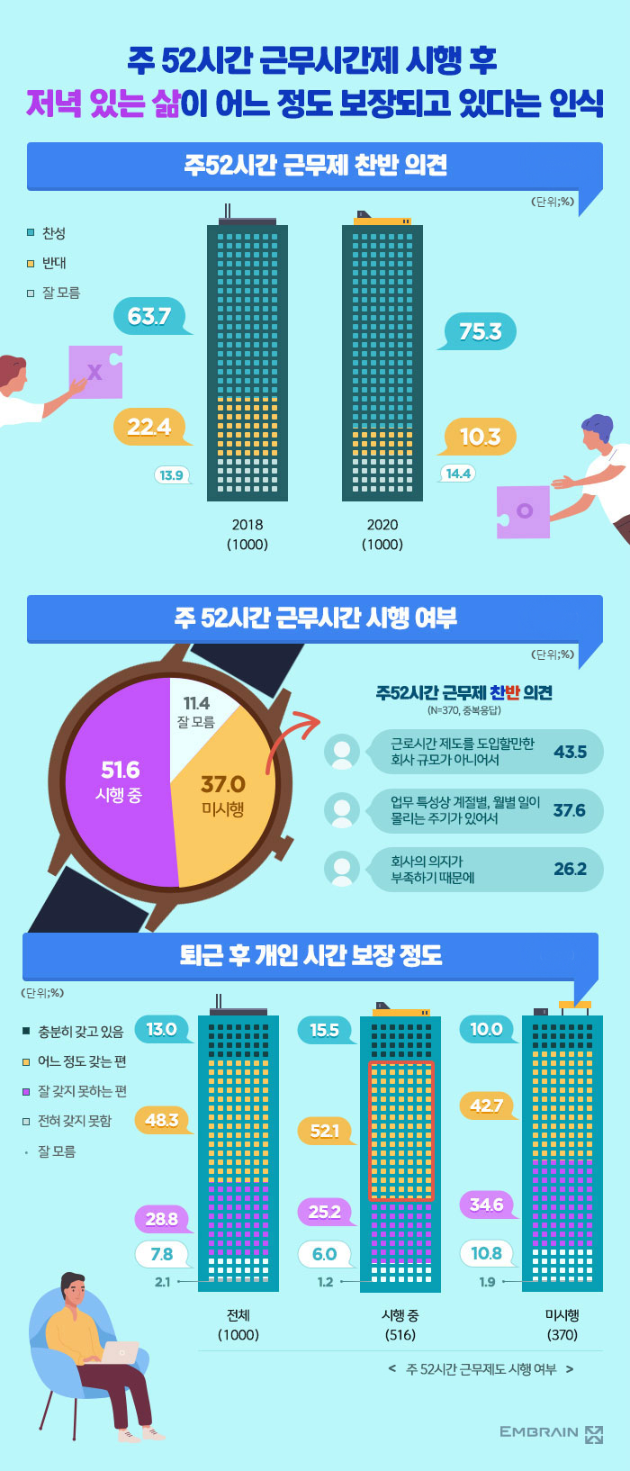 ‘주 52시간 근무제’에 찬성하는 의견(18년 63.7%→20년 75.3%) 더 많아져
