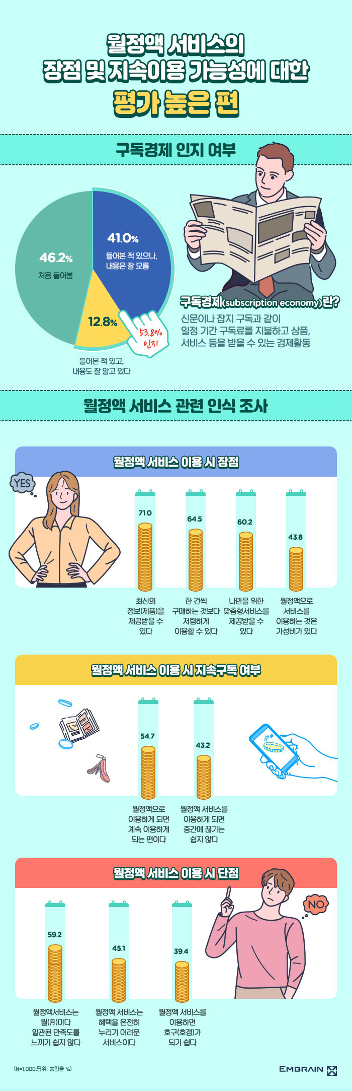 → 이처럼 긍정적인 평가가 많은 만큼 지속적으로 구독 서비스를 경험해 보고 싶어하는 소비자들이 많은 것은 당연하다고 볼 수 있다. 전체 응답자의 65%가 앞으로 보다 더 다양한 구독서비스를 경험해보고 싶다는 바람을 내비친 것으로, 젊은 층일수록 다양한 구독 서비스를 경험해보고 싶은 마음(10대 78.4%, 20대 73.7%, 30대 71.4%, 40대 52.3%, 50대 61.8%, 50대 52.8%)이 커 보였다. 앞으로 등장할 구독 서비스가 이전에는 경험해보지 못한 새로운 경험을 제공해줄 것이라는 기대감(66.5%)도 컸다. 물론 모든 것을 소유하기에는 경제적 부담이 크다는 현실적인 문제도 구독 서비스의 이용이 증가할 것이라는 예상을 가능케 하는 이유였다. 실제 소비자 10명 중 7명(70%)은 구독 서비스의 이용이 증가하는 것은 전반적인 의식주 비용이 높아지는 것과 관계가 있다고 바라봤다. 다만 구독 서비스의 이용을 껄끄럽게 생각하는 시각도 일부 존재하는 것으로 보여졌다. 가령 전체 응답자의 60%가 한번 구독 서비스를 이용하게 되면 서비스를 중단하기가 쉽지 않을 것 같다는 생각을 내비쳤다. 구독 이후 일정 시간이 지나면 해지할 타이밍을 놓치거나 귀찮게 여기면서, 서비스 중단을 하지 못하는 경우가 발생한다고 보는 것이다. 어느 정도 ‘비용’에 대한 부담감도 느끼는 모습이었다. 구독 서비스의 가장 대표적인 방식인 ‘월정액 서비스’로 살펴보면, 소비자의 74%가 다달이 일정하게 내는 비용이 솔직히 부담이 된다고 응답했다. 물론 기본적으로 한 건씩 구매하는 것보다 저렴하게 이용할 수 있다(64.5%)는 인식이 강했으나, 여러 서비스를 이용할 경우 비용 부담을 피하기는 어렵기 때문일 것이다. 그래도 월정액 서비스 이용은 가성비가 있고(동의 43.8%, 비동의 22%), 합리적인 비용으로 제공되는 것 같다(동의 41.3%, 비동의 22.7%)는 인식이 좀 더 큰 편으로, 주로 젊은 층이 월정액 서비스의 이용금액을 합리적이라고 인식했다. 그밖에 월마다 일관된 만족도를 느끼기가 쉽지 않다고 생각하는 소비자(59.2%)도 적지 않았다.